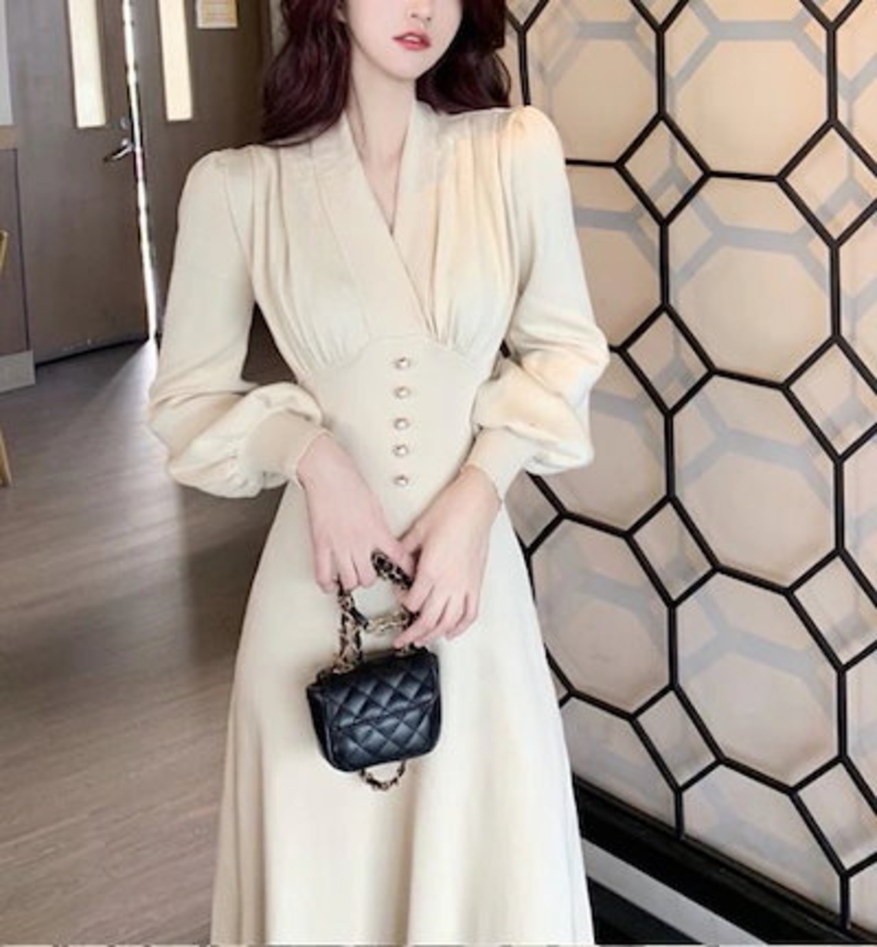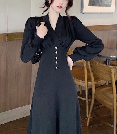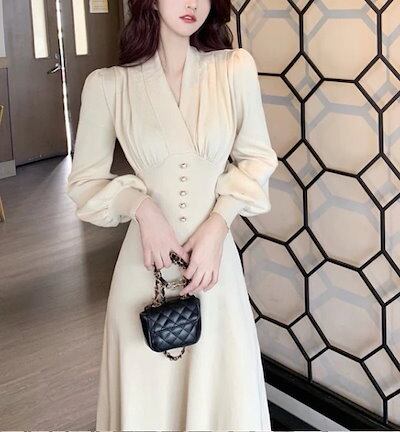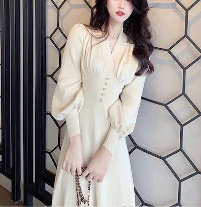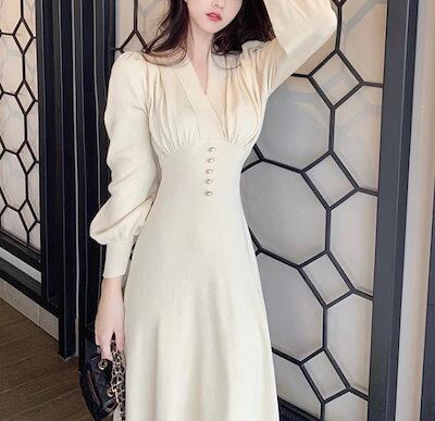 【2枚購入で 2oo円OFF!】新作 おしゃれ 気質 ワンピース Vネック 長袖 ウエスト引き締め ニットワンピース 通勤 ロングワンピース