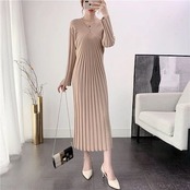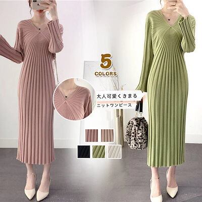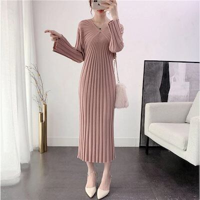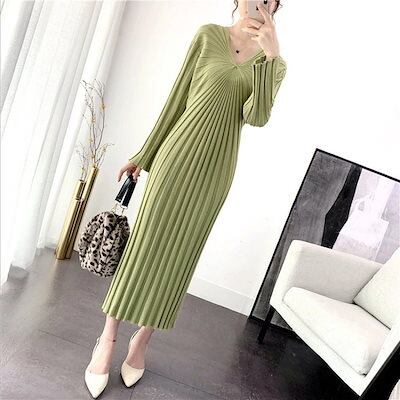 【2枚購入で 3oo円OFF!】新作 おしゃれ 気質 ワンピース Vネック 長袖 ニットワンピース 通勤 ロングワンピース