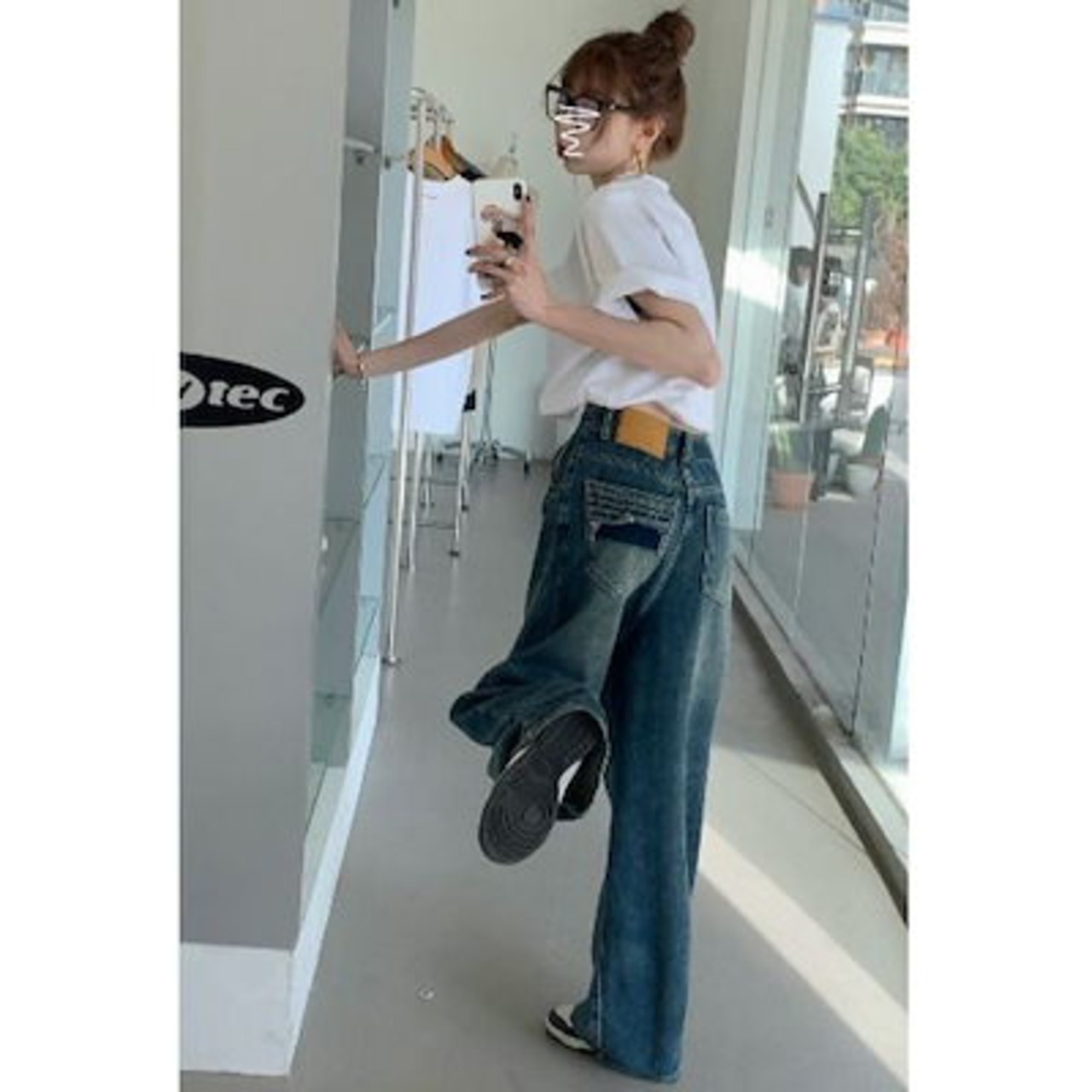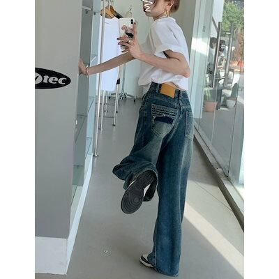 大人気 デニムパンツ 秋 新作 パンツ デニム ジーンズ ワイド ストレート ハイウエスト 細見え 春 カジュアル ファッション お出かけ レディース 脚長効果 美脚効果