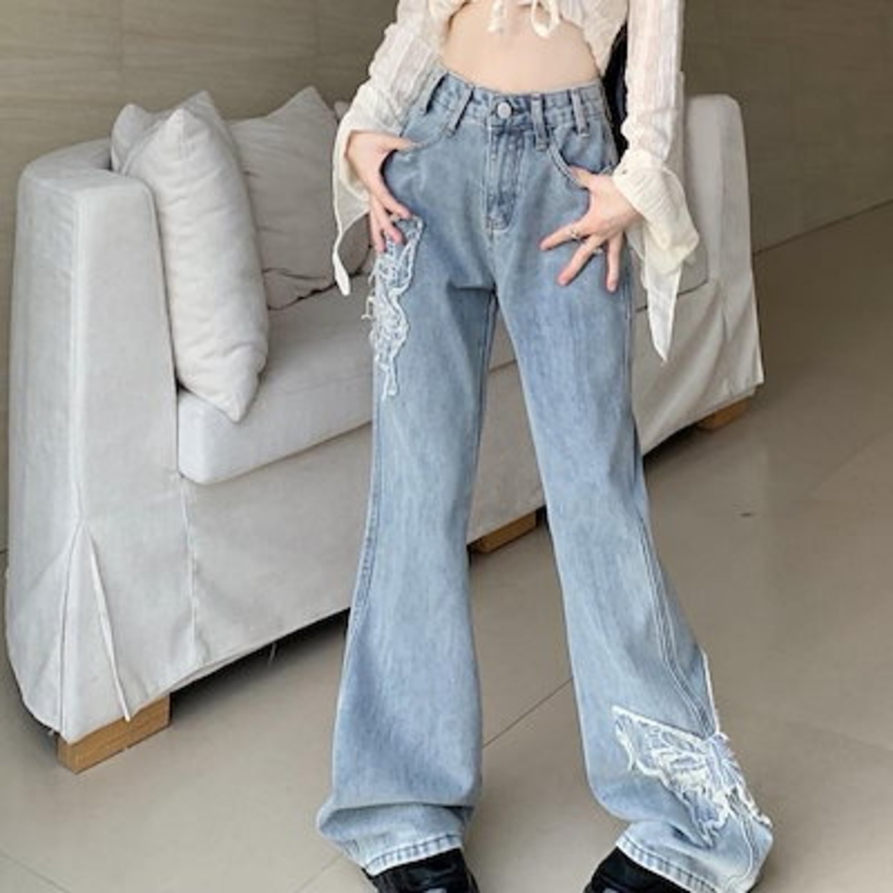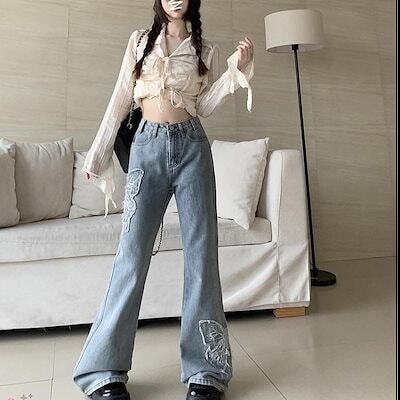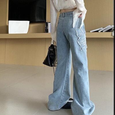 大人気 デニムパンツ 秋 新作 ハイウエスト フリンジ ボトムス レッグ ゆるダボ ゆったり カジュアル ストリート 切りっぱなしカットオフ 加工 肌見せ ジーパン レディース 脚長効果 美脚効果