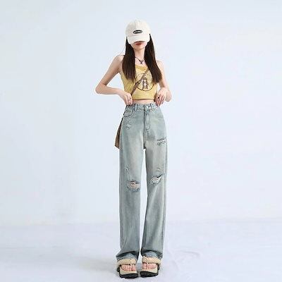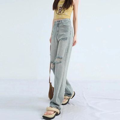 大人気 デニムパンツ 秋 新作 ダメージジーンズ ハイウェスト 着痩せ ワイドパンツ 春夏 スト レート モップパンツ レディース 脚長効果 美脚効果
