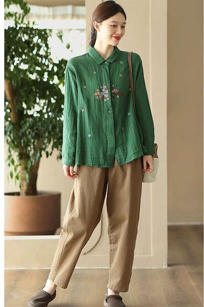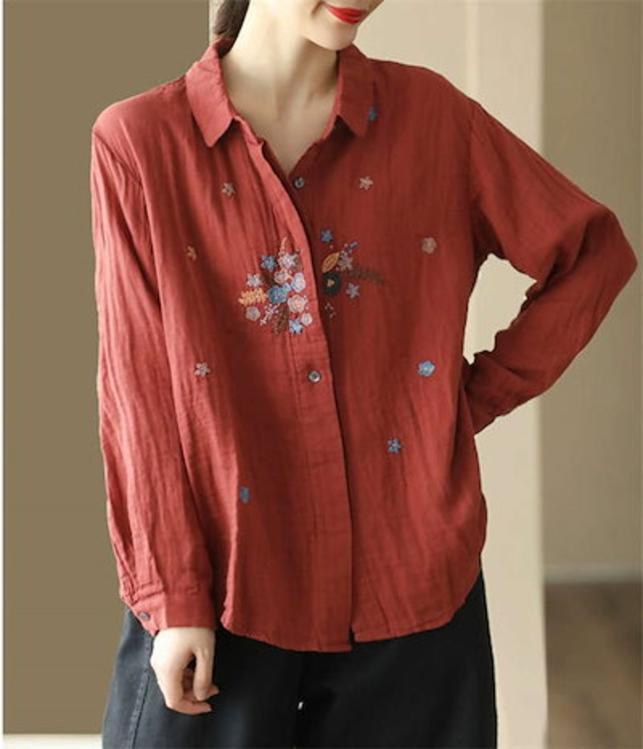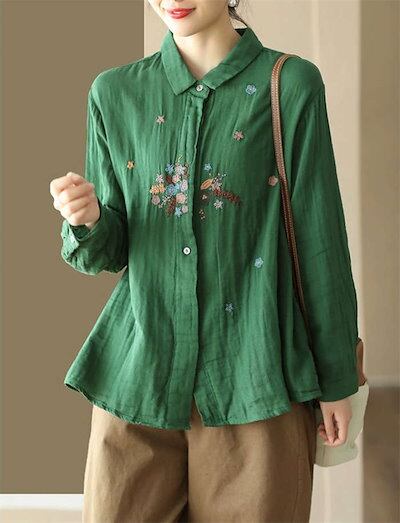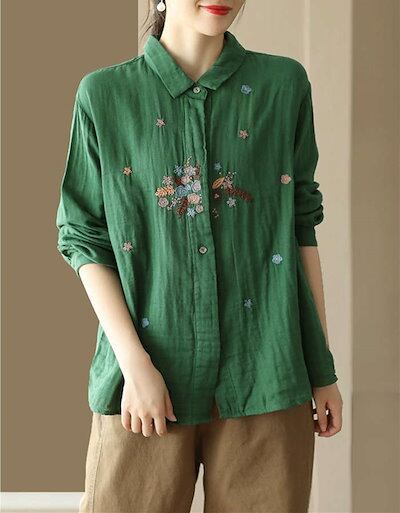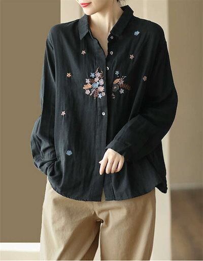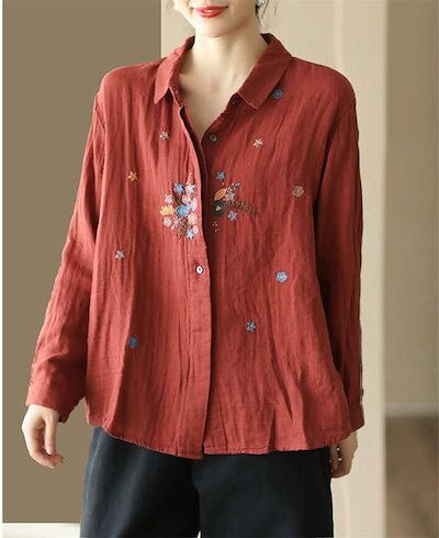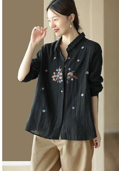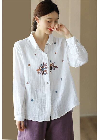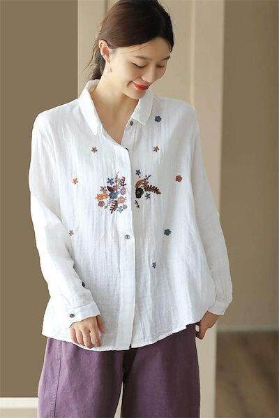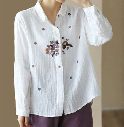 シャツ レディース 長袖 秋 綿 ダブルガーゼ シャツ チュニック 春 夏 秋 刺繍 ブラウス コットン100% カジュアル ナチュラル 柔かい ホワイト ブラック ゆったり 30代 40代 50代