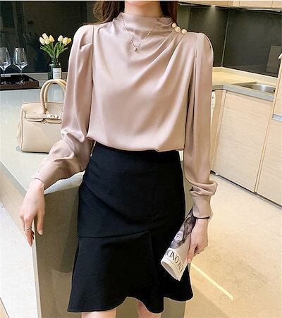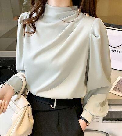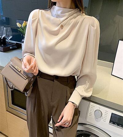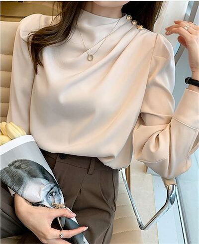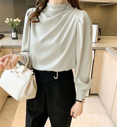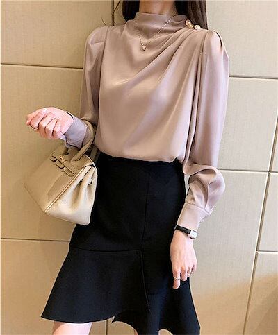 ブラウス レディース 長袖トップス シフォン シャツ インナー レディース 春 秋 プチハイネック 二の腕カバー きれいめ エレガント ビジネス オフィスウェア 無地 ゆったり オシャレ ギャザー 上