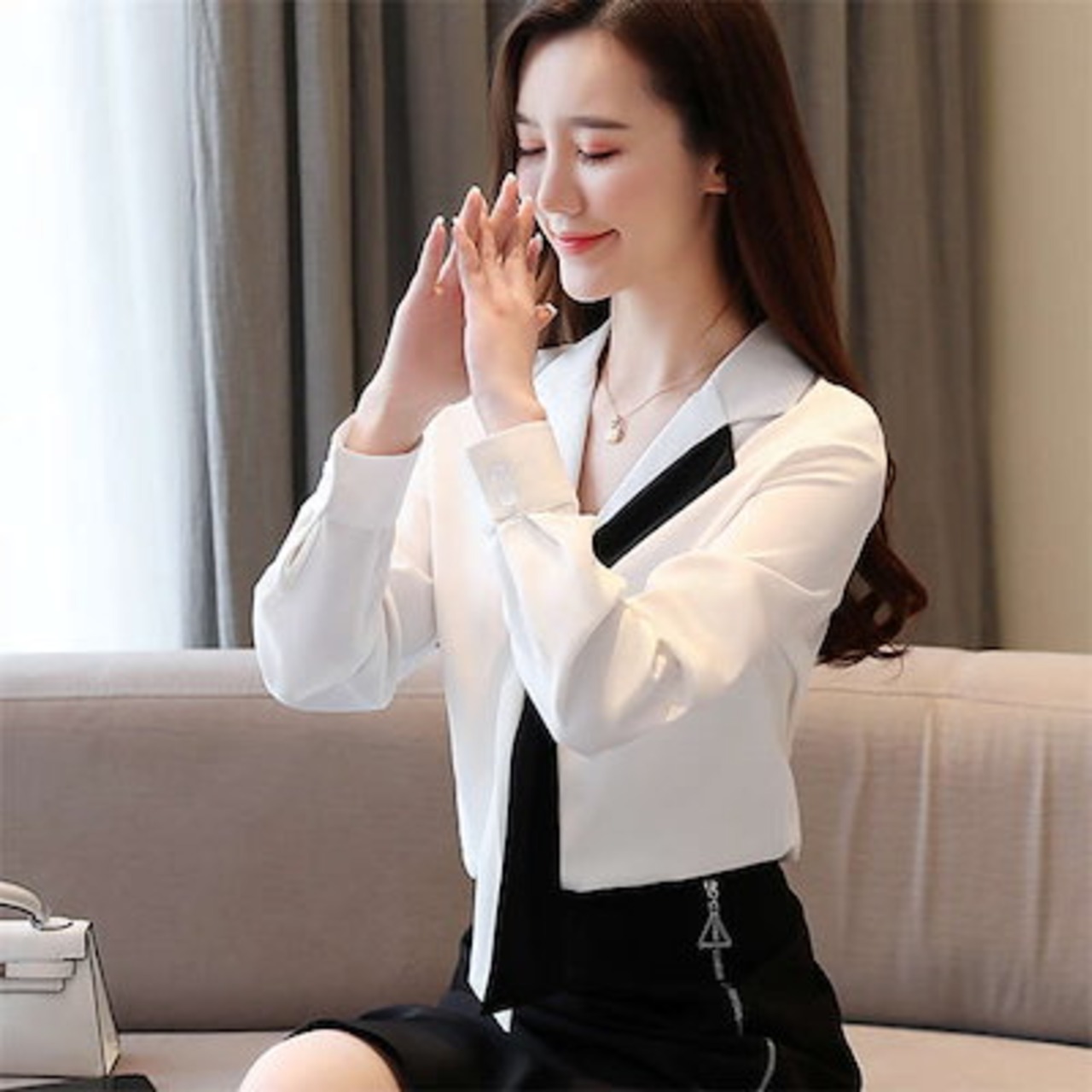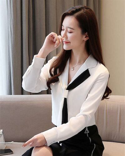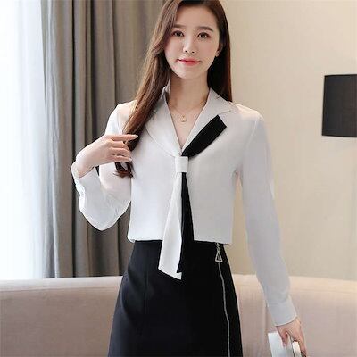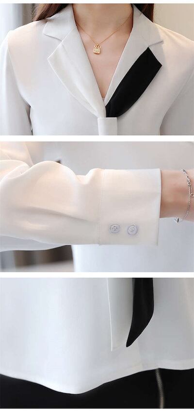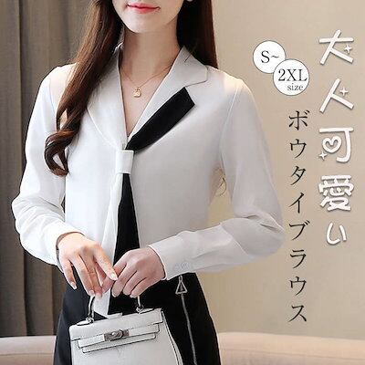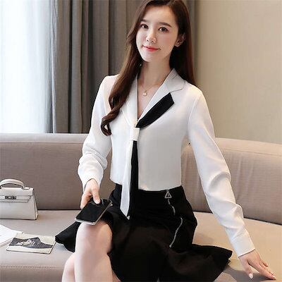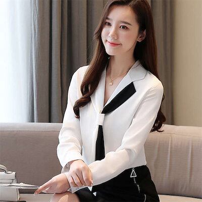 ブラウス レディース トップス ボウタイブラウス Vネック オフィス カジュアル 通勤 シフォン オフィス きれいめ オシャレ お洒落 シンプル シャツブラウス 配色 長袖 シフォン リボン ボウタイ