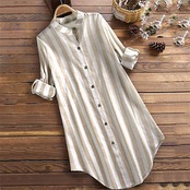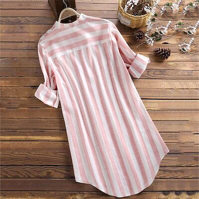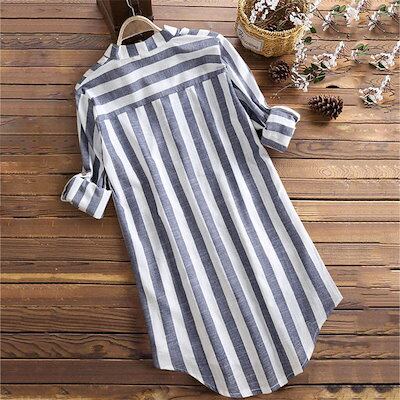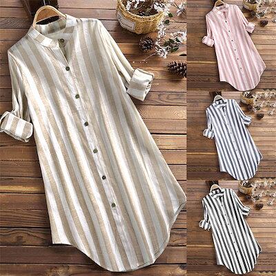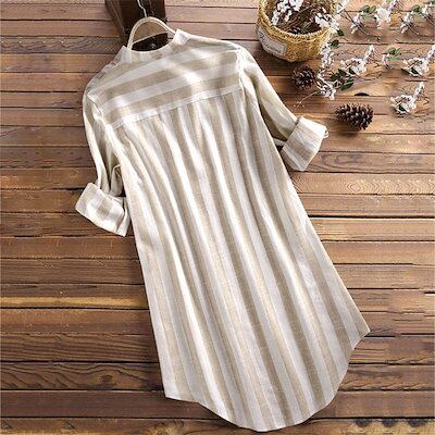 シャツ ロングシャツ 春 夏 チュニック ロング丈 シャツ ブラウス トップス レディース ストライプ柄 長袖 綿麻 コットンリネン 前開き アウター シンプル カーディガン チュニックシャツ ゆった