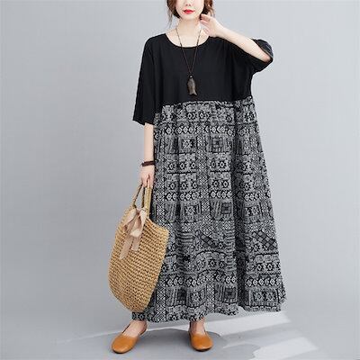 ワンピース マキシ丈 大きいサイズ 半袖 レディース 綿麻 ロングワンピース ゆったり リネン コットン 薄手 夏 キレイめ ゆったり フレア 体型カバー エスニック ルーズ ナチュラル 着痩せ 大人