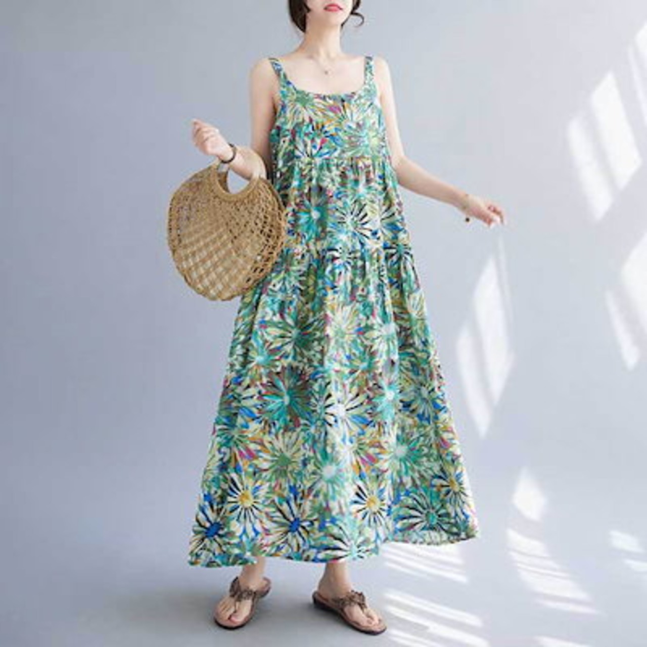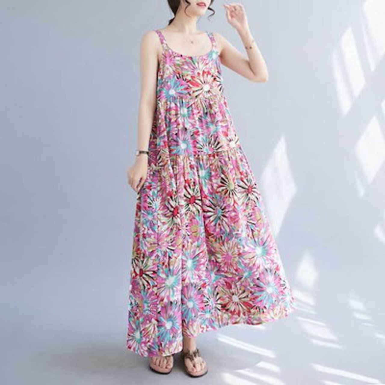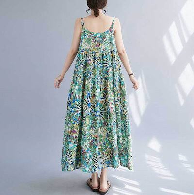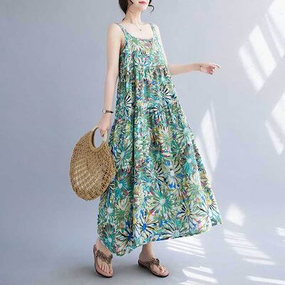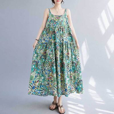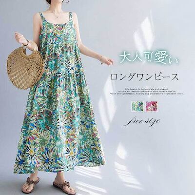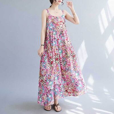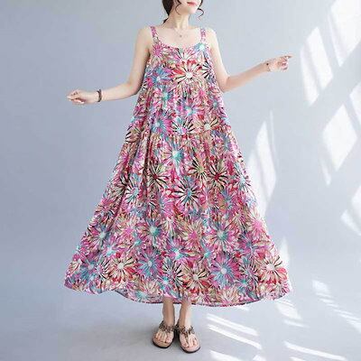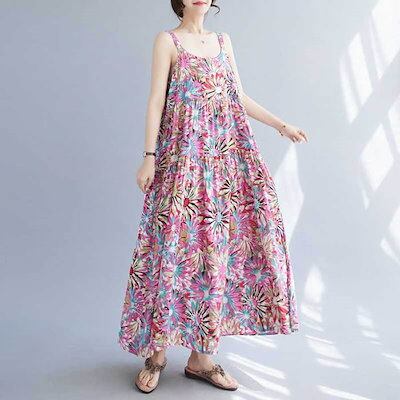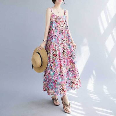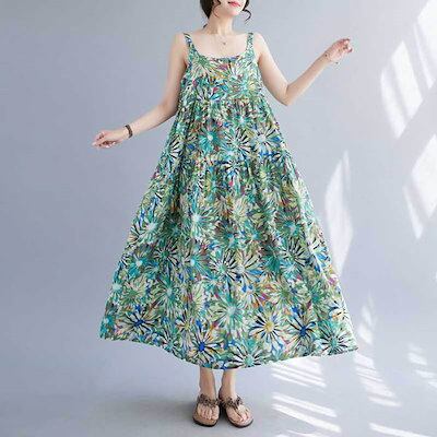 ワンピース 総柄 リゾートワンピ ノースリーブ 綿麻 ハワイアン 夏 ロングワンピース マキシワンピ リゾート リゾートワンピース マキシ丈 大人 タンクワンピース おしゃれ 可愛い 森ガール 体型カ