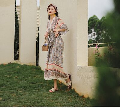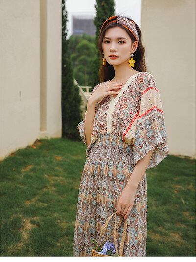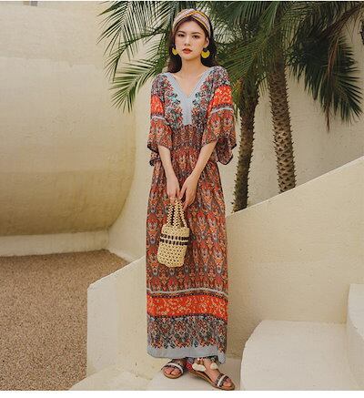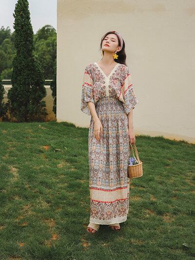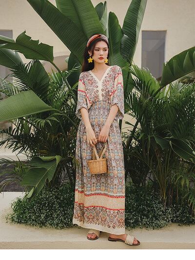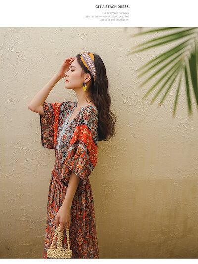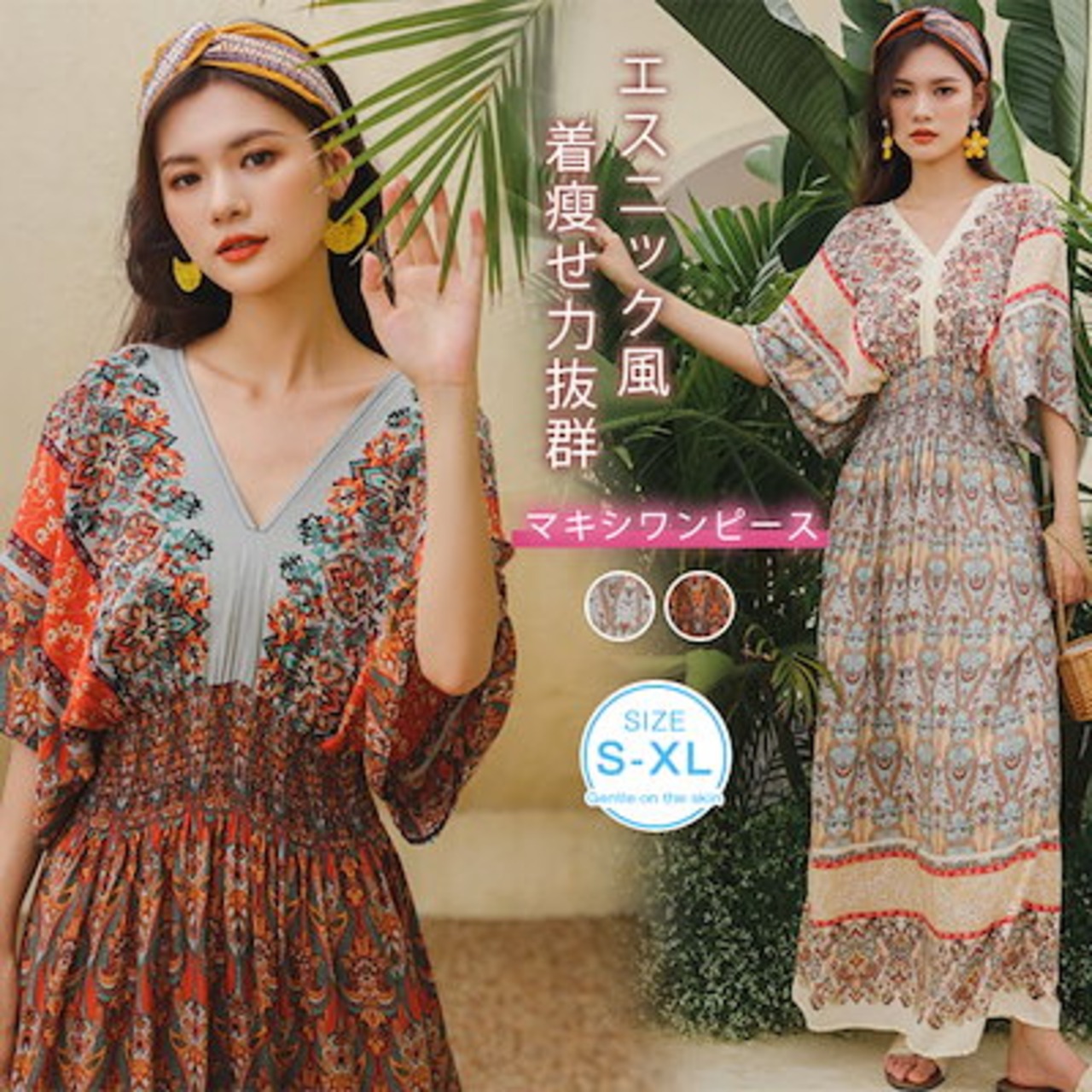 マキシワンピース 半袖 リゾートワンピ ハワイアン きれいめ ワンピース 夏 ボリューム袖 マキシワンピ リゾート 半袖 リゾートワンピース 花柄 総柄 マキシ丈 大人 ボヘミアン ビーチ Vネック