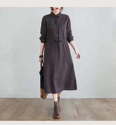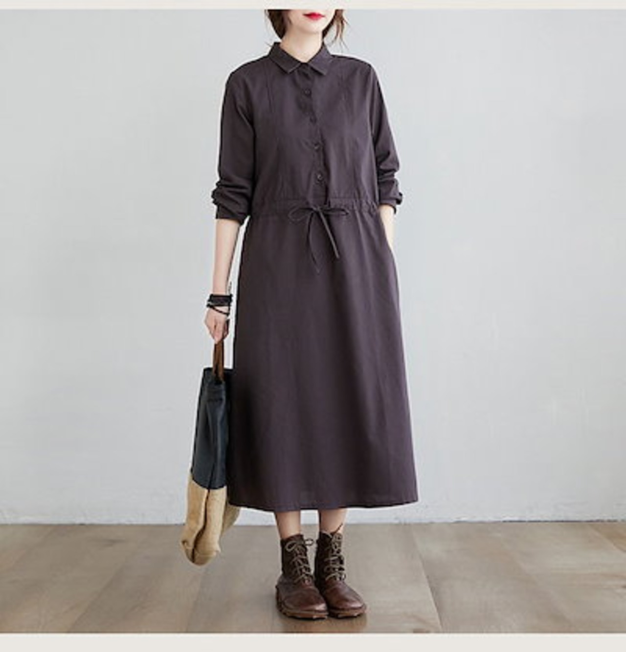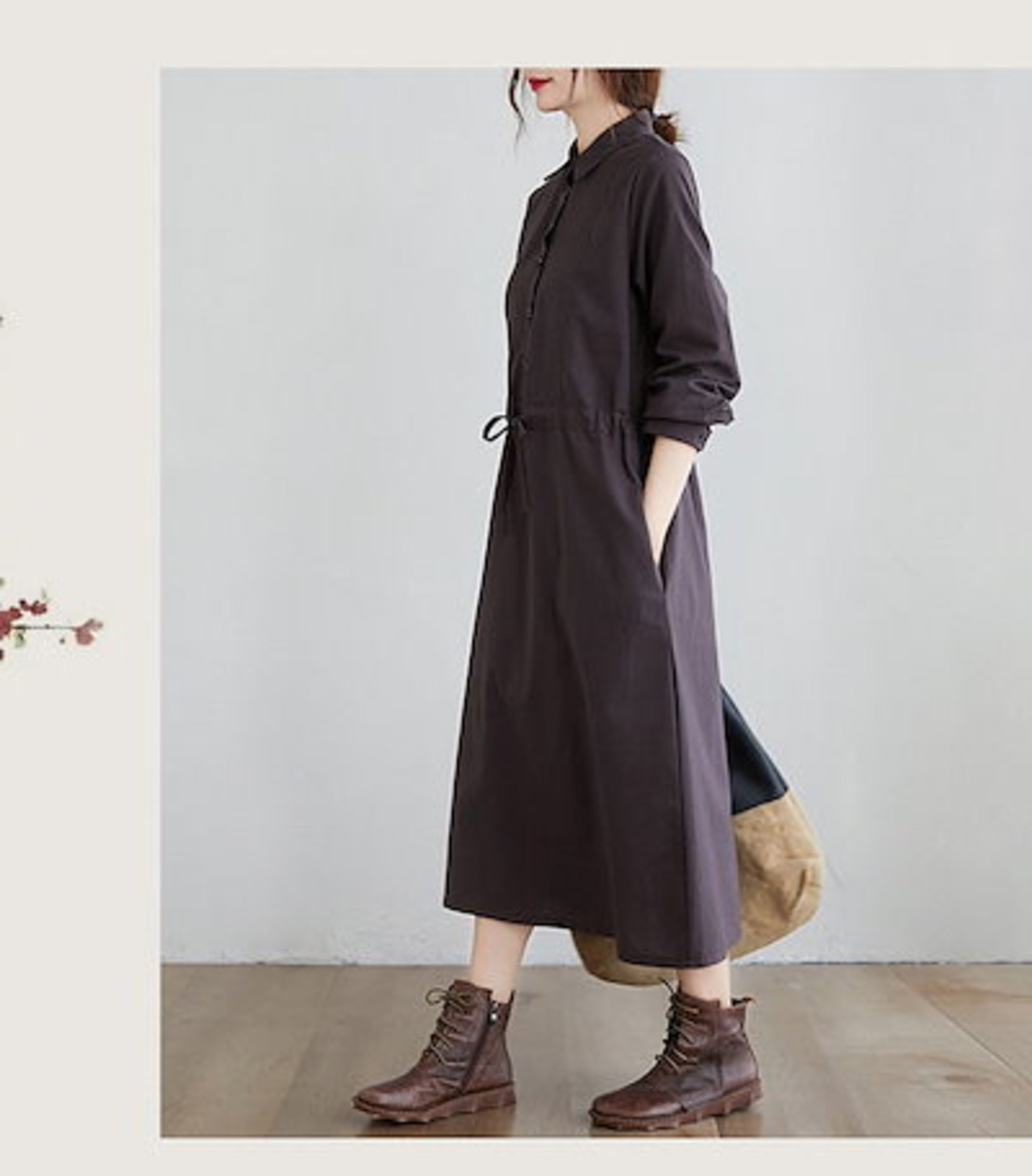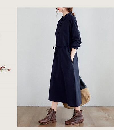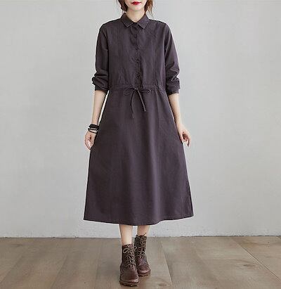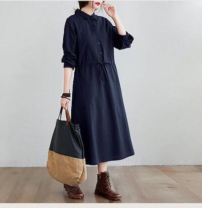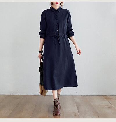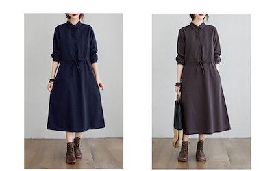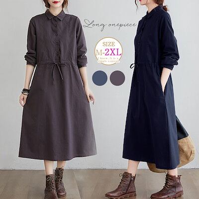 コットンリネン ワンピース 秋 長袖 ロングワンピース 無地 ロングワンピ 綿麻 シャツワンピース ミモレ シャツワンピ ベスト デザイン 大人 きれいめ ゆったり おしゃれ 大人 可愛い ポケット付
