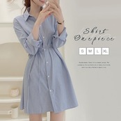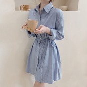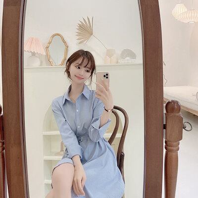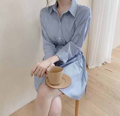 シャツワンピース レディース ワンピース ショート丈 シャツワンピ ストライプ 長袖 ワンピ おしゃれ ブルー ベスト付き きれいめ ゆったり