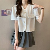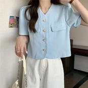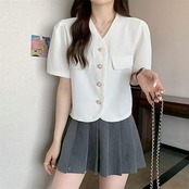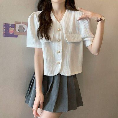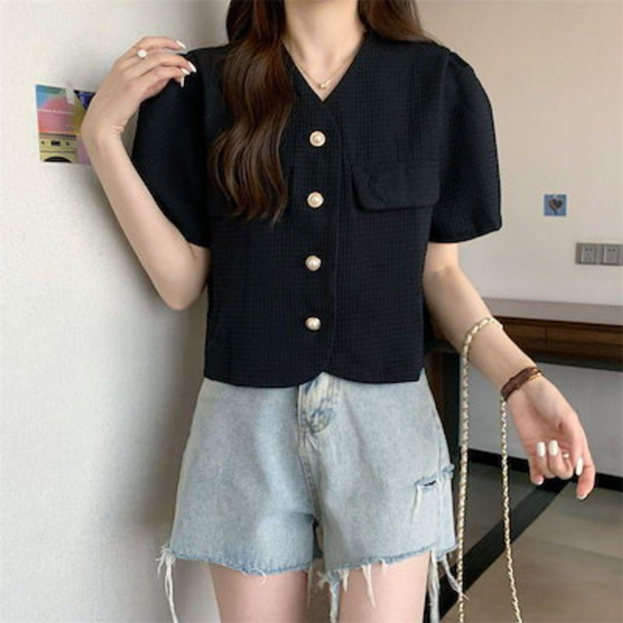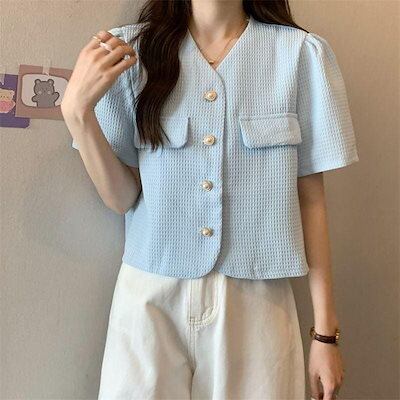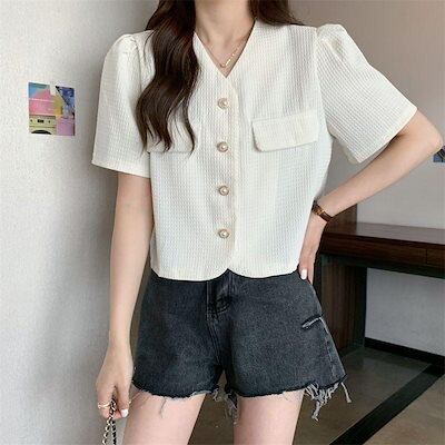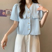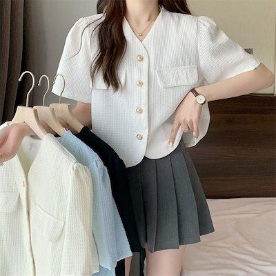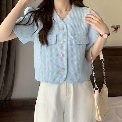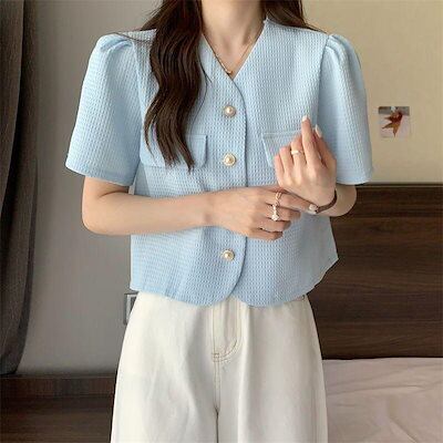 ツイード風 半袖ジャケット レディース 韓国風 ノーカラー 半袖 クロップド丈 ショート丈 お出かけ ガーリー 無地 単色 ツイード 春 夏