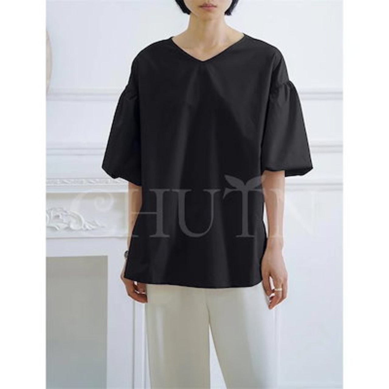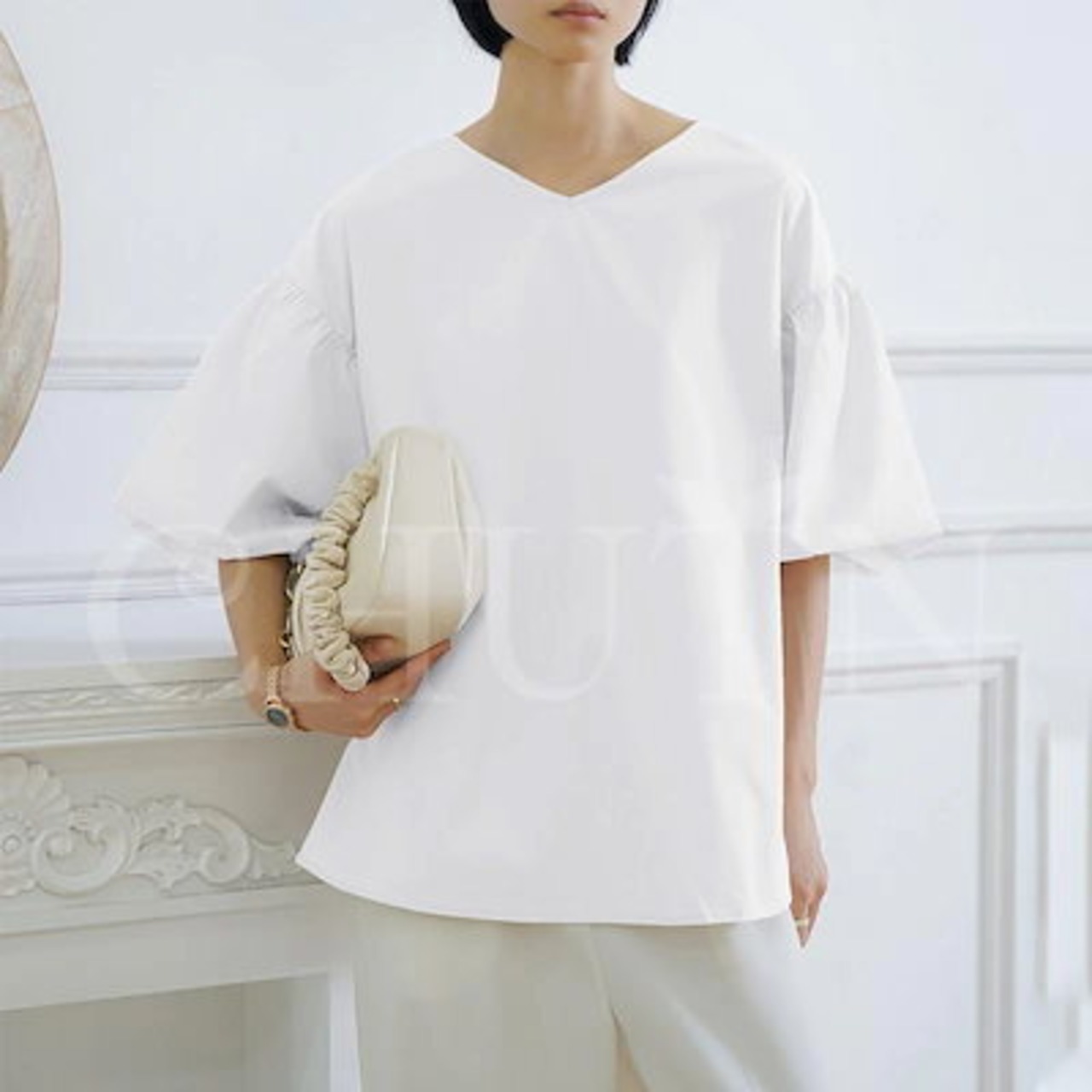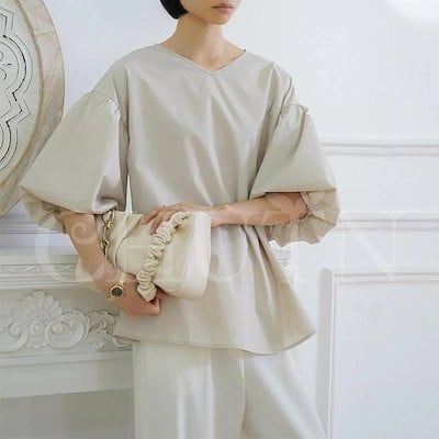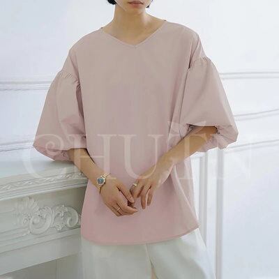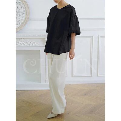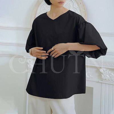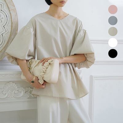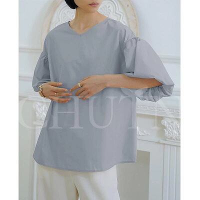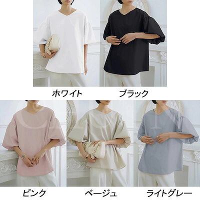 シャツ ブラウス ハリ感袖ボリュームVネックブラウス 半袖 バックリボン レディース オフィスブラウス 無地 着痩せ ゆったり 体型カバー おしゃれ 通勤大人