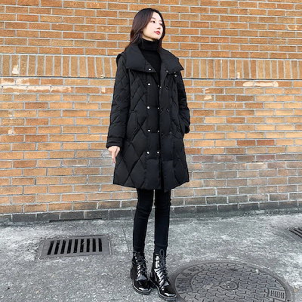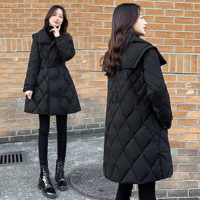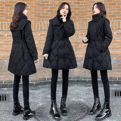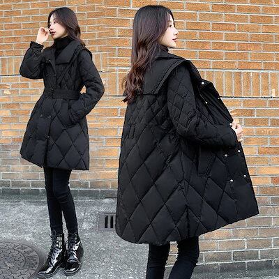 AWアウター新作 体型カバー ウエスト引き締め セミロング 中綿コート ブラック 細見え 気質 厚手 防寒カジュア 裏起毛ファッション ダウンジャケット