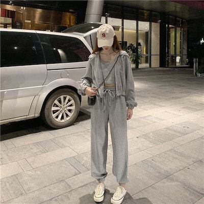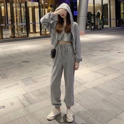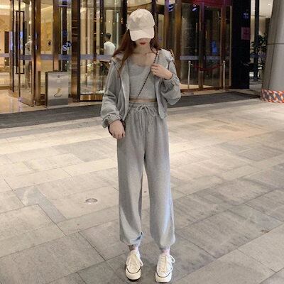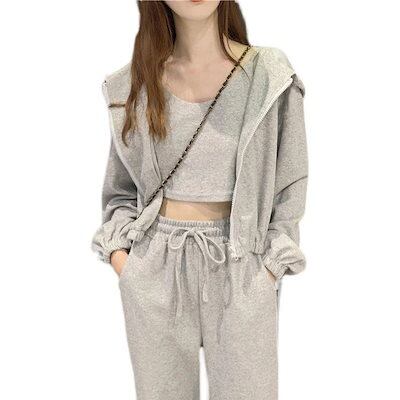 【2枚購入で 2oo円OFF! 】おしゃれスリーピース女装です運動着です無地カジュアルフード付きパーカーです運動セット女です