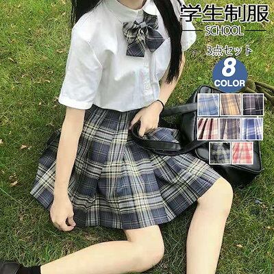 制服 学生制服 3点セット スクール スカート チェック柄 上下セット 蝶ネクタイ付き プリーツスカート 半袖シャツ セーラー服 スクール制服 高校生 中学生 女子高校生 春 春服 夏 夏服 S M