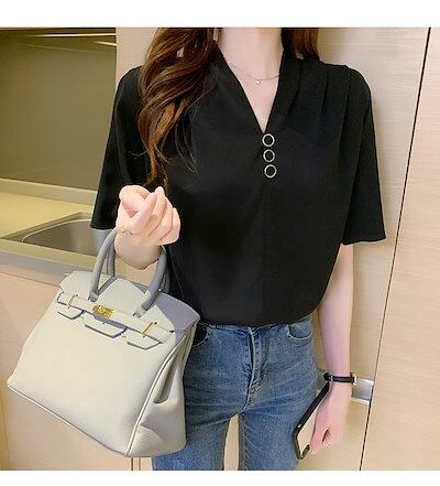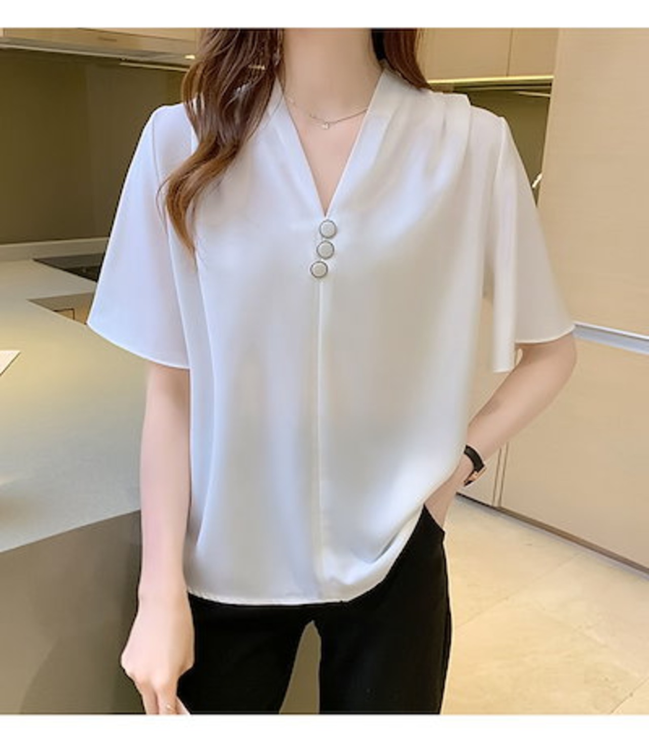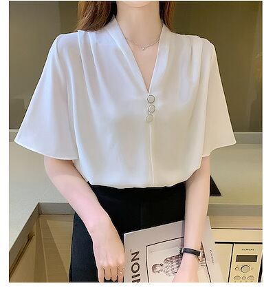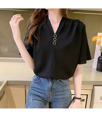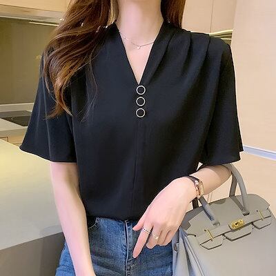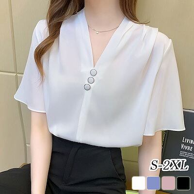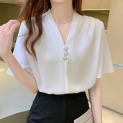 ブラウス レディース 半袖ブラウス 夏 オフィスブラウス 白Vネック オシャレブラウス シフォントップス 韓国風 大人 上品 通勤OL ゆったりシャツ 40代 30代
