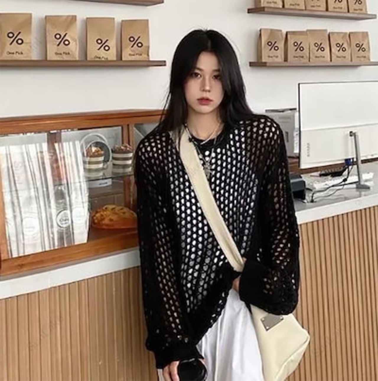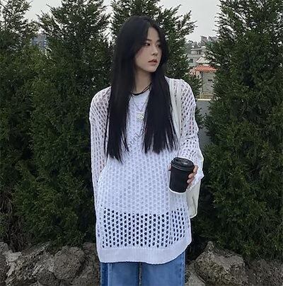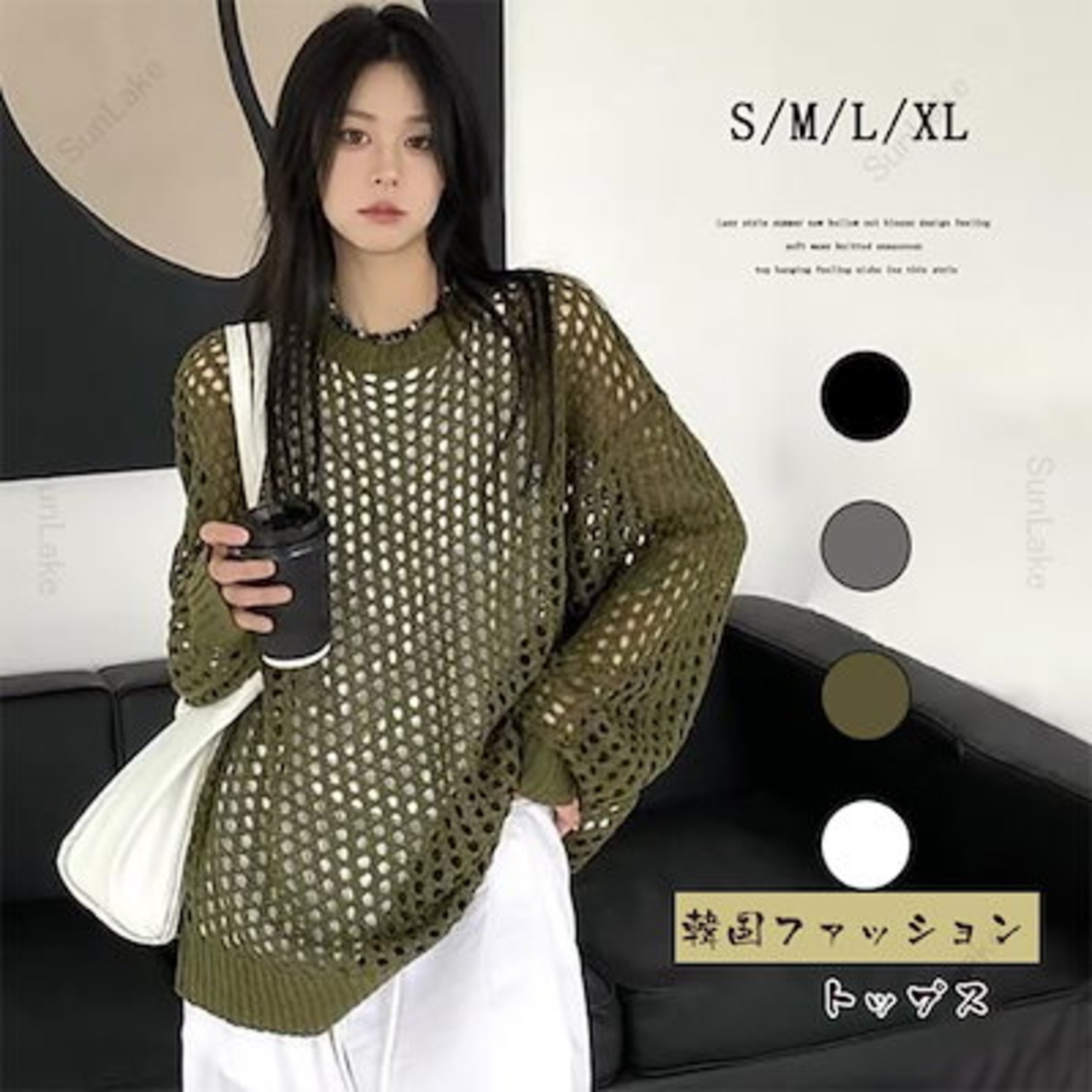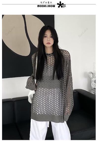 2023新品秋夏 セットアップ レディースロング透かし彫りトップス 韓国風 キレイめ 着痩せニット 透かし編みメッシュニット /メッシュニット