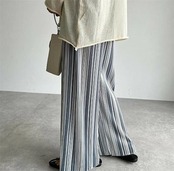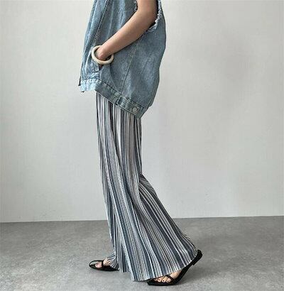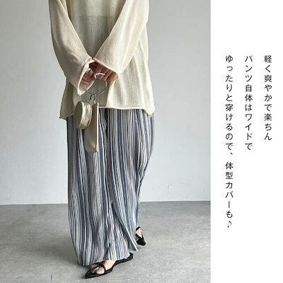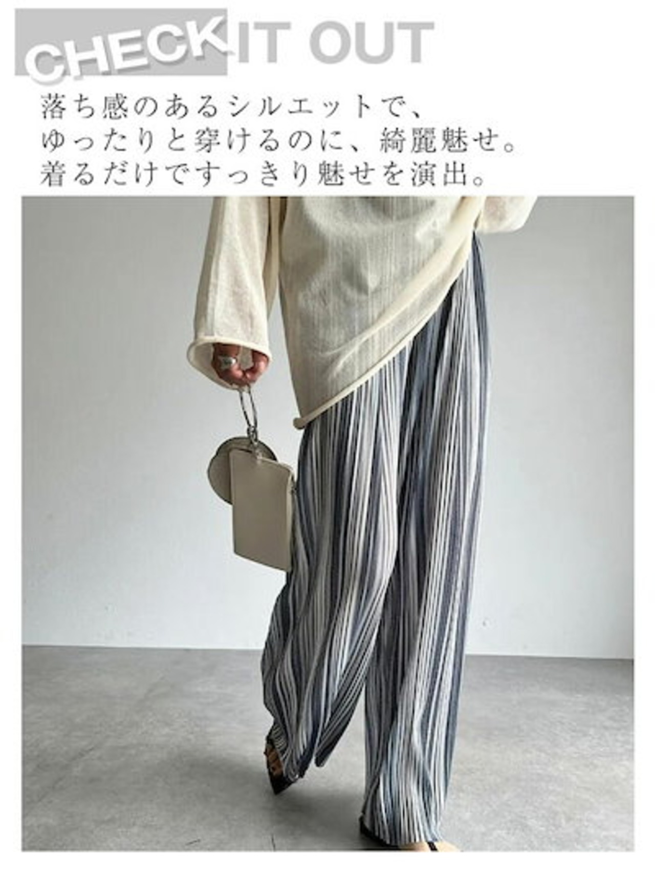 ワイドパンツ 春夏 プリーツパンツ レディース ストライプパンツ 涼感 プリーツワイドパンツ ロングパンツ 配色 ボトムス ウエストゴム 冷感素材 カジュアル 涼しい 爽やか 薄手 シンプル 大きいサ