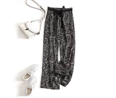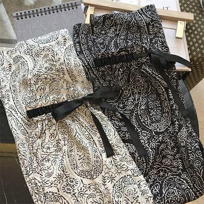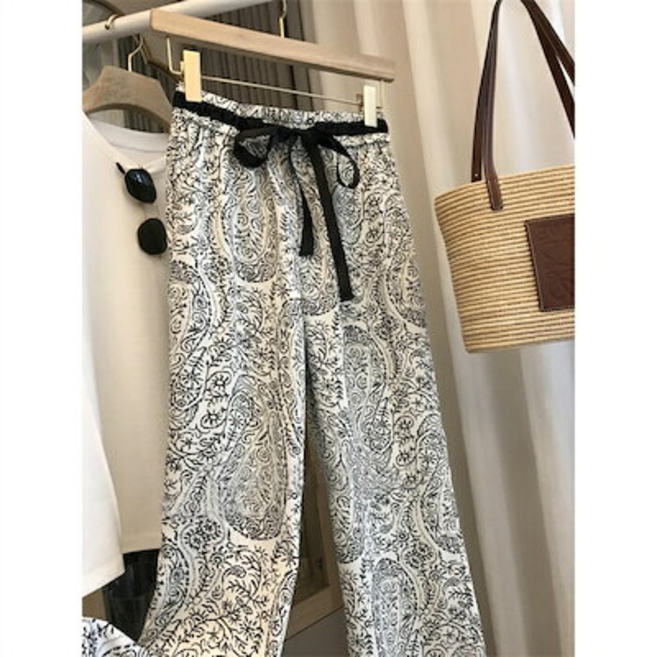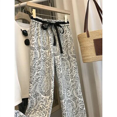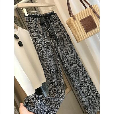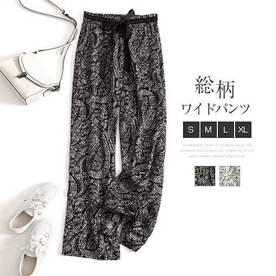 ワイドパンツ レディース 夏用 パンツ 総柄 エスニック風 ストレートパンツ 薄手 リゾートパンツ きれいめ 夏 ウエストゴム ウエストリボン ボトムス ゆったり 体型カバー 涼しい 爽やか ひんやり