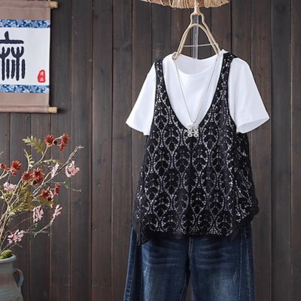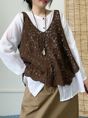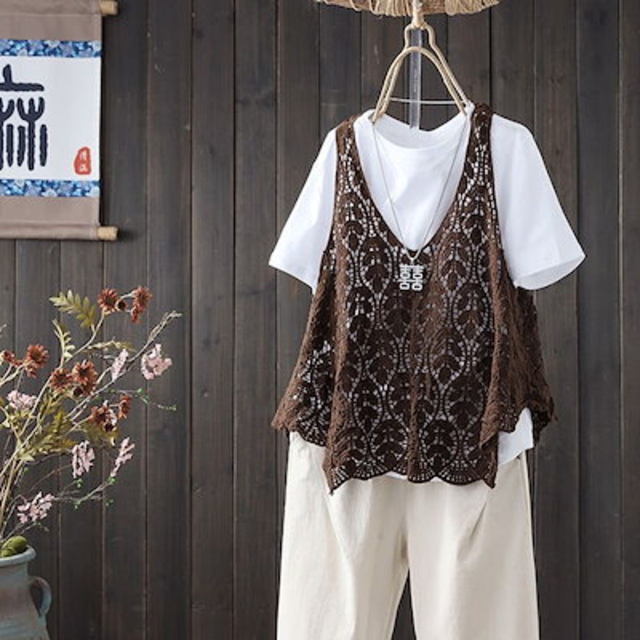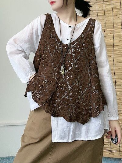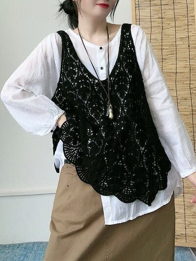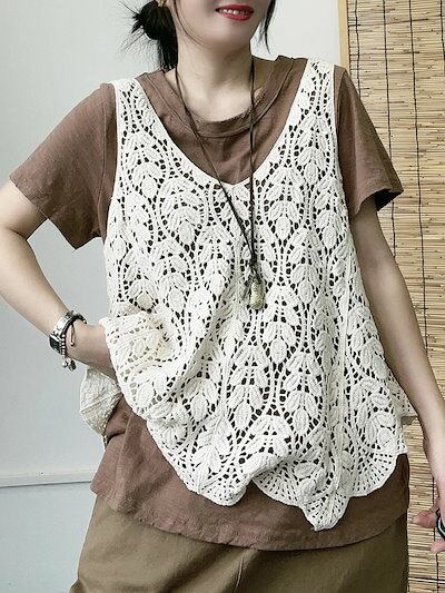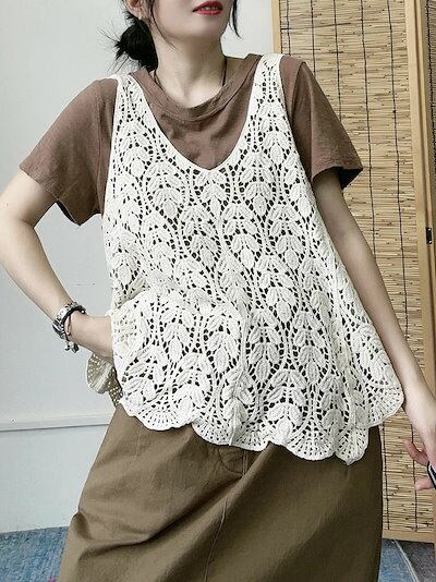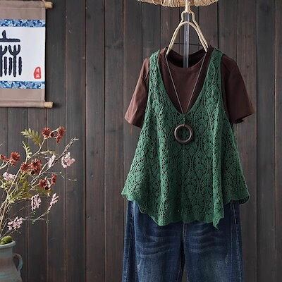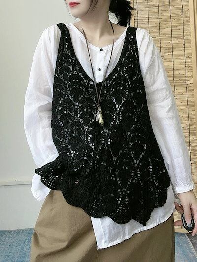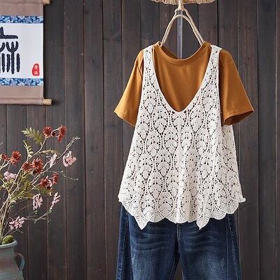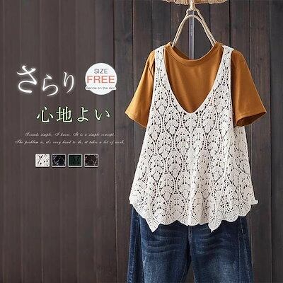 透かし編み ベスト 綿 レディース 春 夏 ライトニット トップス 涼やか カジュアル レイヤード ニットベスト かぎ編み ベスト ノースリーブ サマーニット vネック おしゃれ きれいめ 透け 大人