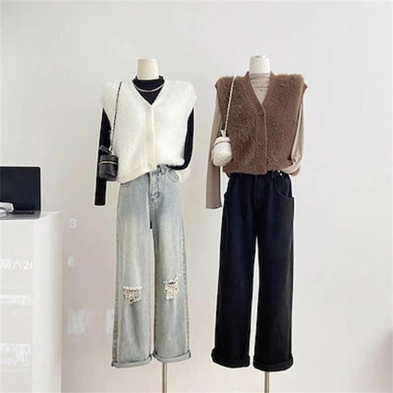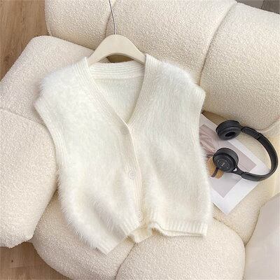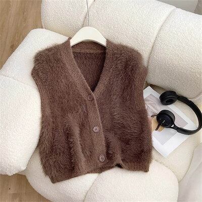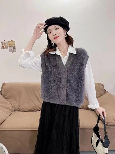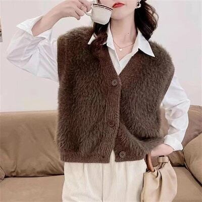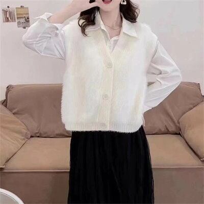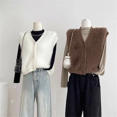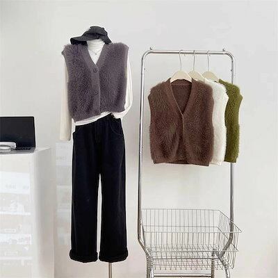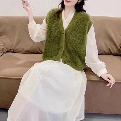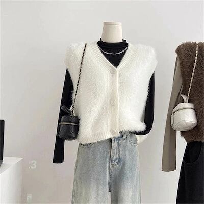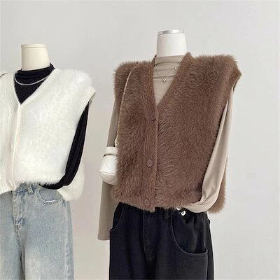 ファーベスト vネック シャギーベスト レディース ベスト ニット ジレ ふんわり 前開き ニットベスト 秋冬 トップス 無地 カジュアル お洒落 羽織り ノースリーブ 暖かい 防寒 もこもこ レイヤ