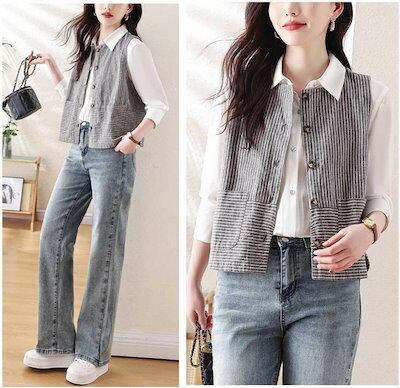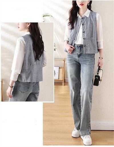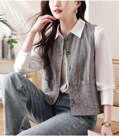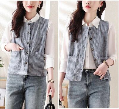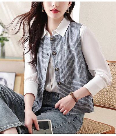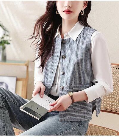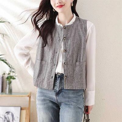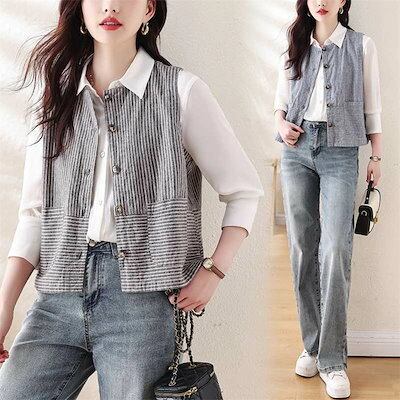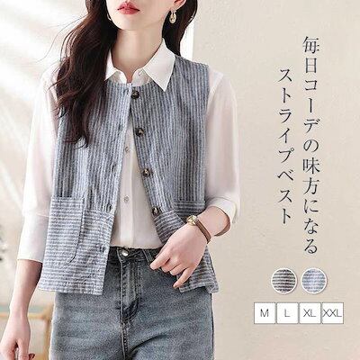 ベスト ジレ コットン ストライプ レディース ジレ ベスト ライトアウター トップス 羽織 ナチュラル 綿 ノースリーブ 春夏 着回し キレイめ ゆったり レイヤード 重ね着 おしゃれ カジュアル