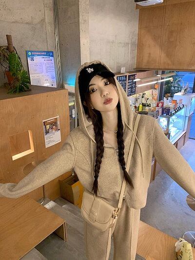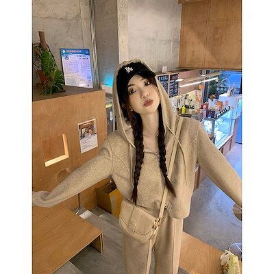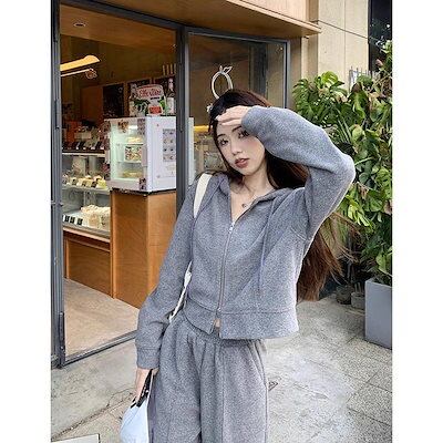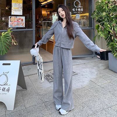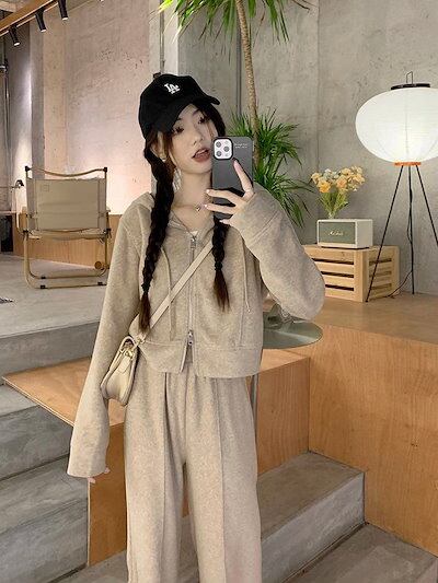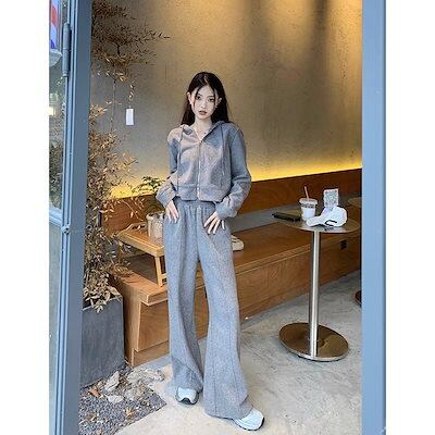 セットアップ レジャースポーツスーツ女性秋の新しいルーズカジュアル韓国版フード付きジップセーターワイドパンツ2点セット