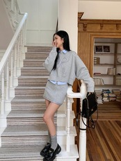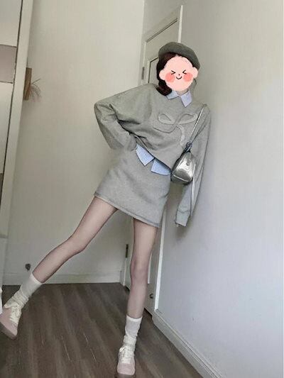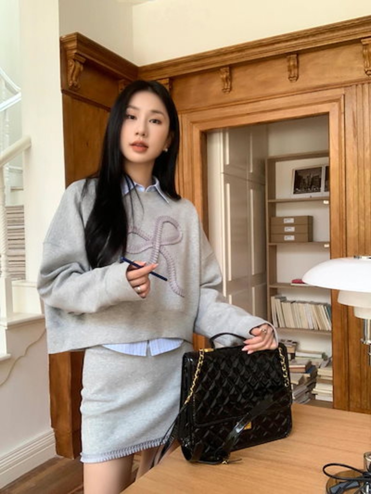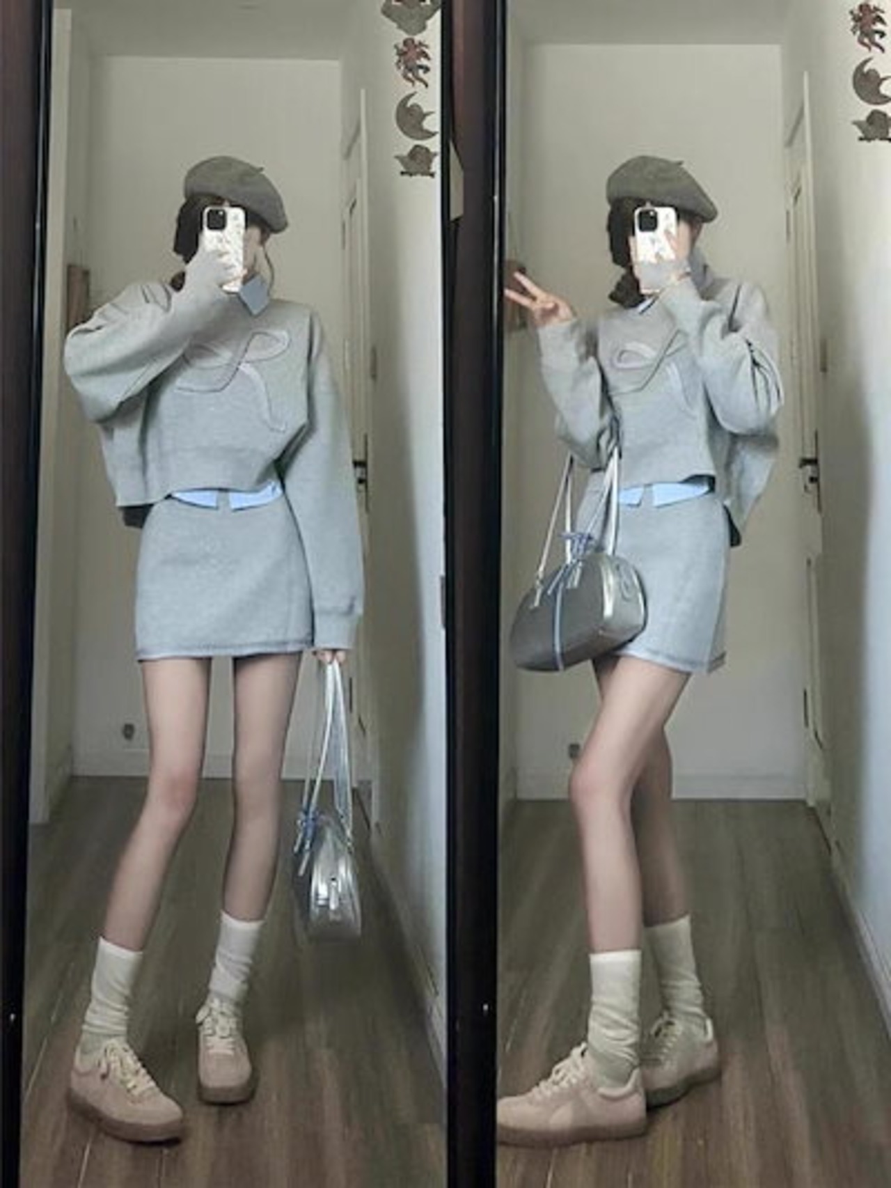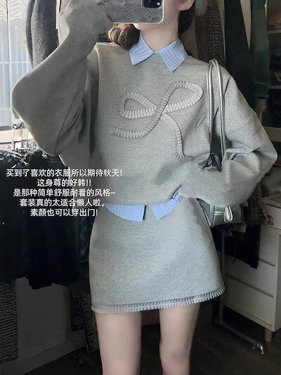 セットアップ デザインセンスショート長袖セーターストライプシャツレース半身スカート女性初秋新作ファッション3点セット