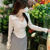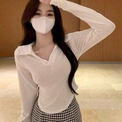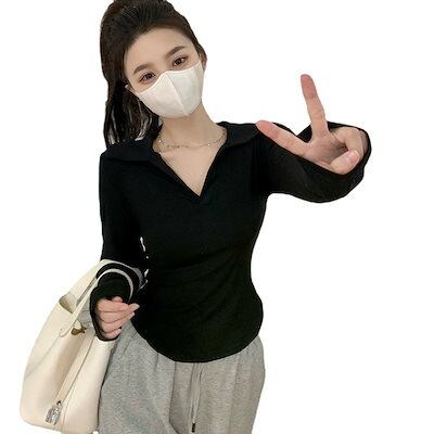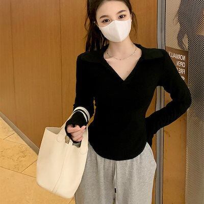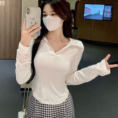 長袖Tシャツ女性薄ボトムシャツラペルインナーボトムシャツスリム不規則なショートトップス
