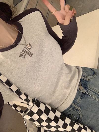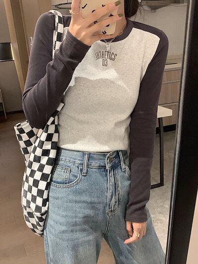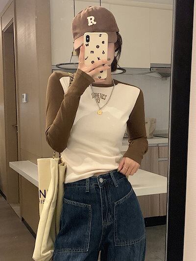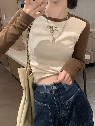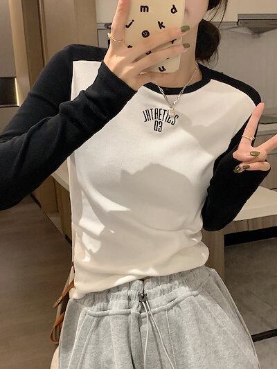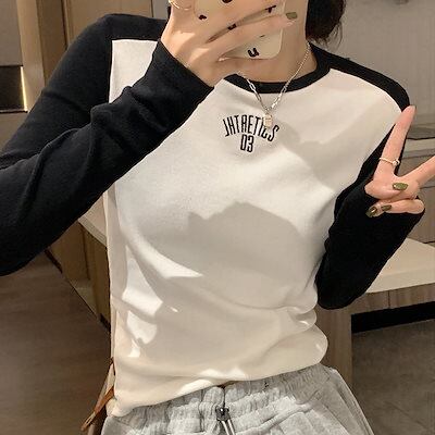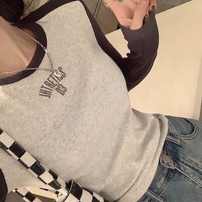 ロンT レタープリントポジティブショルダー長袖Tシャツ女性2024新しいスプライシングスリムインナーショートトップス