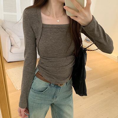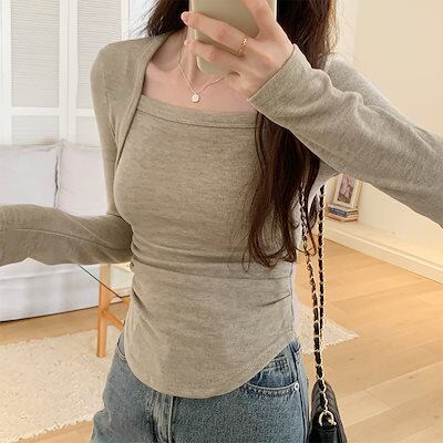 ロンT スクエアネックボトムシャツレディース長袖Tシャツ2024新作ショートスリムスパイスガールズトップス