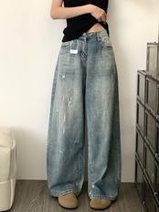 デニムパンツ ワイドレッグジーンズレディース破れたデザインセンス緩いドレープストレートジーンズパンツ