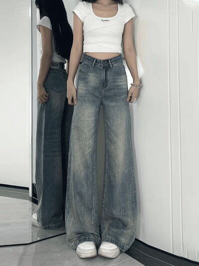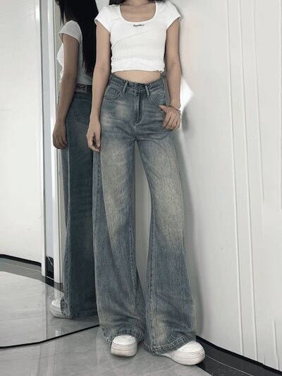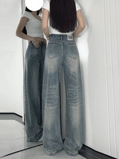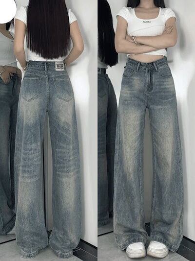 デニムパンツ ハイウエストルーズストレートワイドパンツウォッシュドヴィンテージジーンズ女性春秋新作モデル