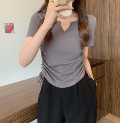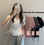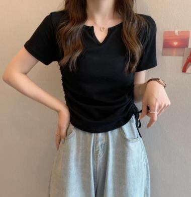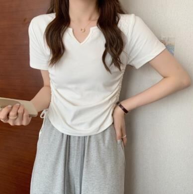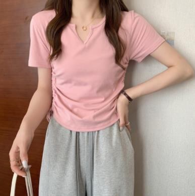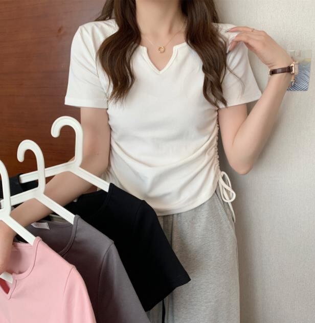 2022春夏新作 レディース 女 半袖 無地 Vネック トップス Tシャツ インナー 4色
