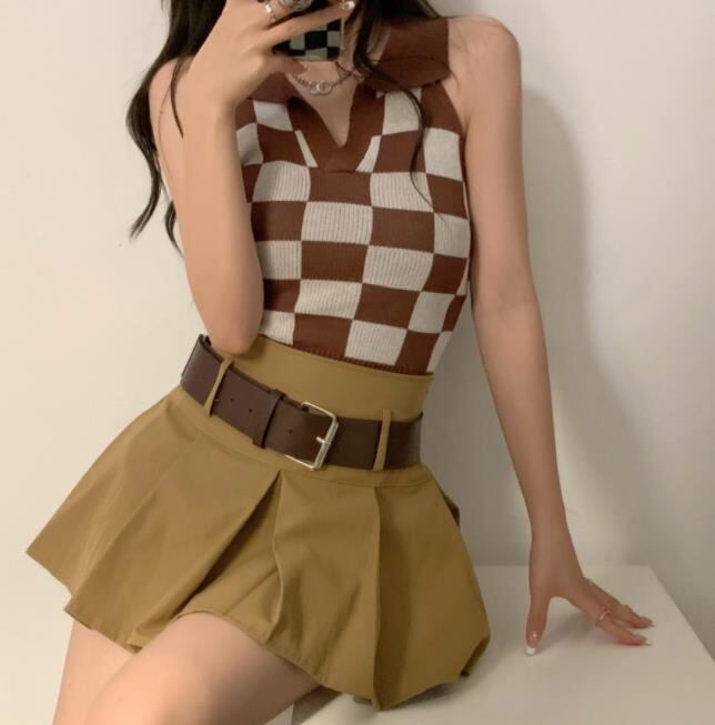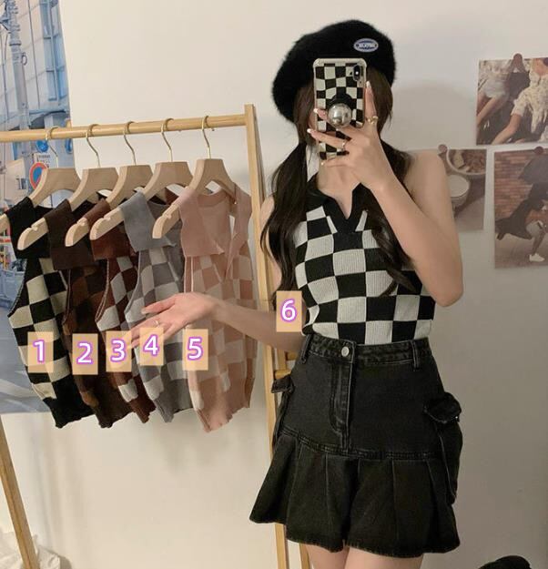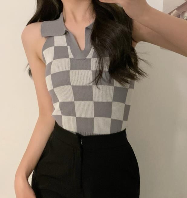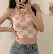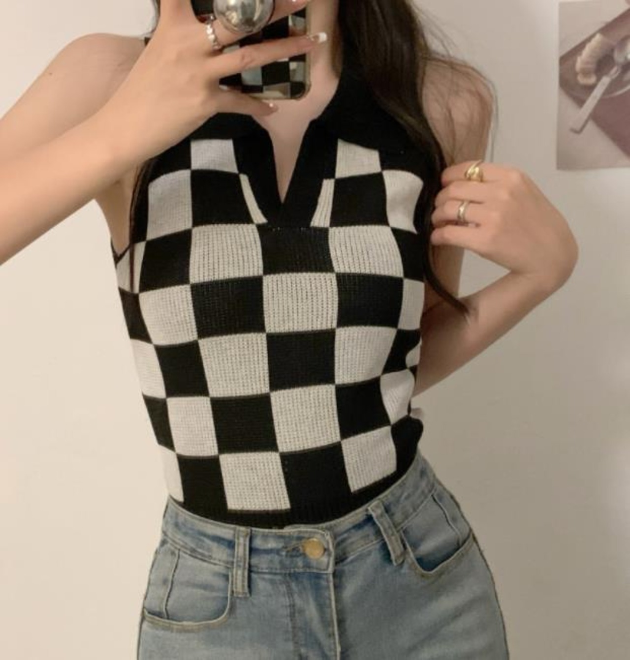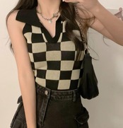 春夏新作 レディース 女 袖なし ニット チェック柄 トップス Tシャツ インナー キャミソール タンクトップ