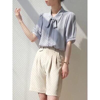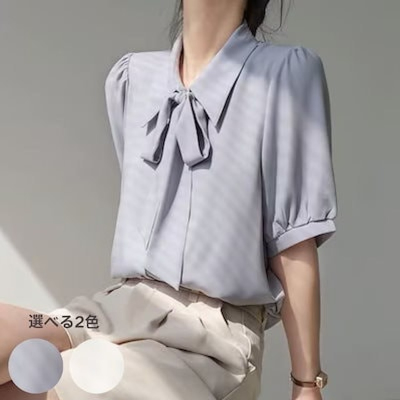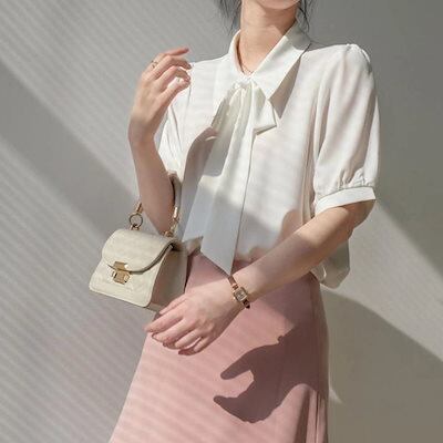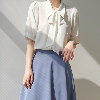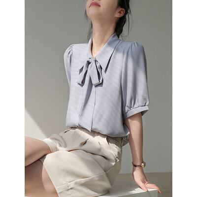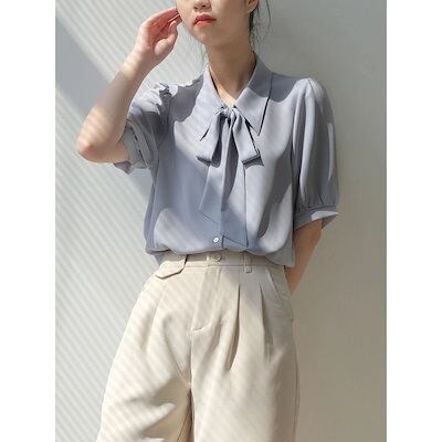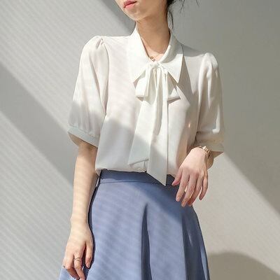 ブラウス 2024リボンシフォン半袖シャツレディースサマーフラッタートップス