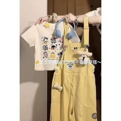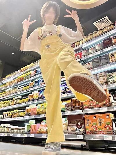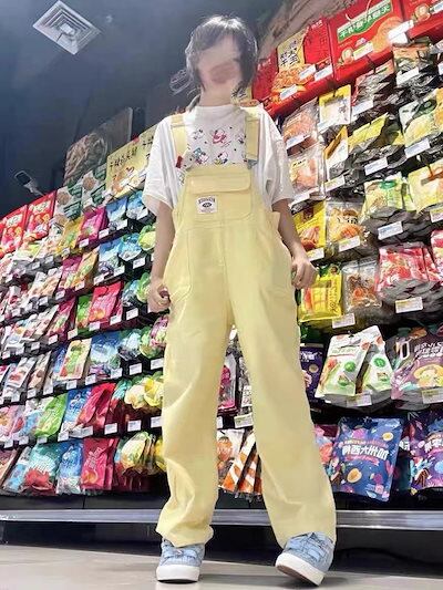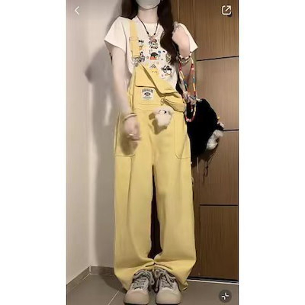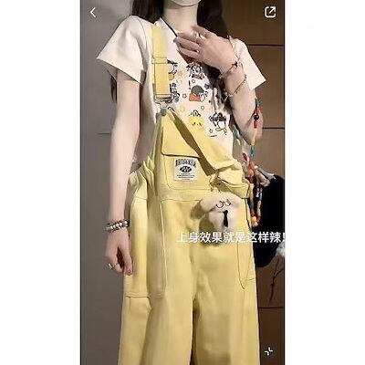 コーデ完成!サロペット クリームデニムバックパックパンツ女性夏ストレートワークワイドパンツルーズジャンプスーツカジュアルパンツ