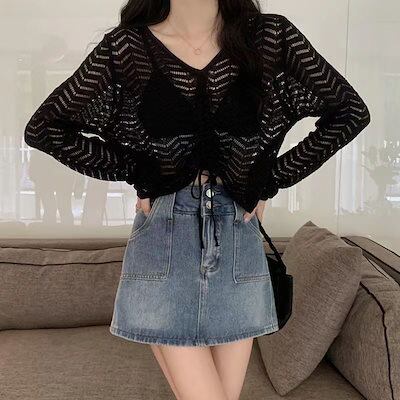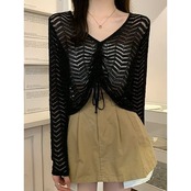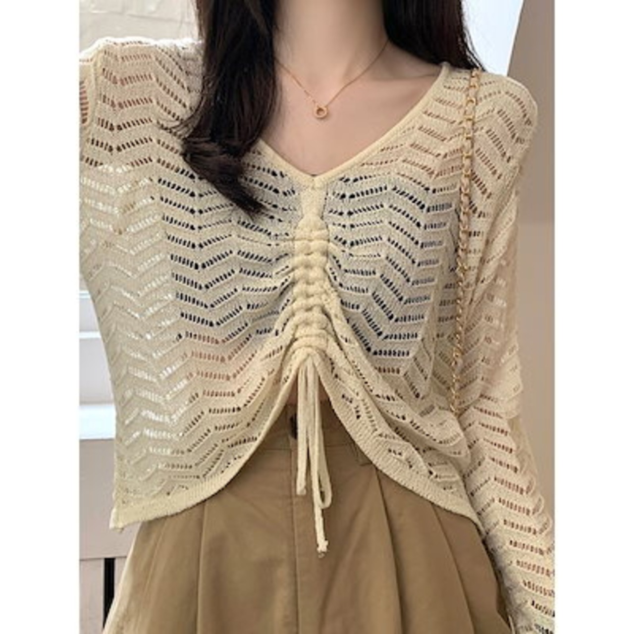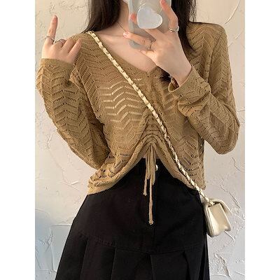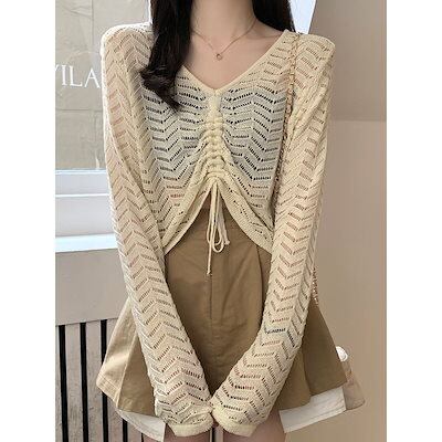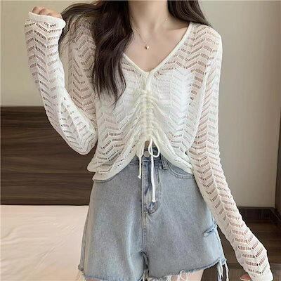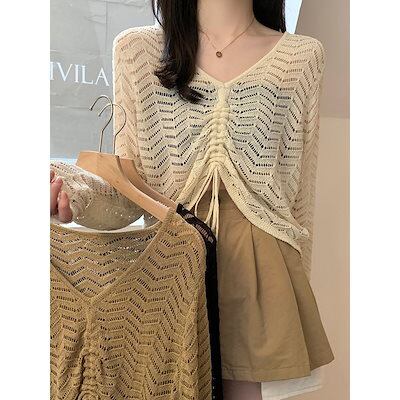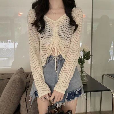 カーディガン ニット セーター レディース 夏 薄手 長袖 ゆったり ドローストリング サンシャツ トップス プルオーバー パーカー ホローアウト