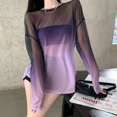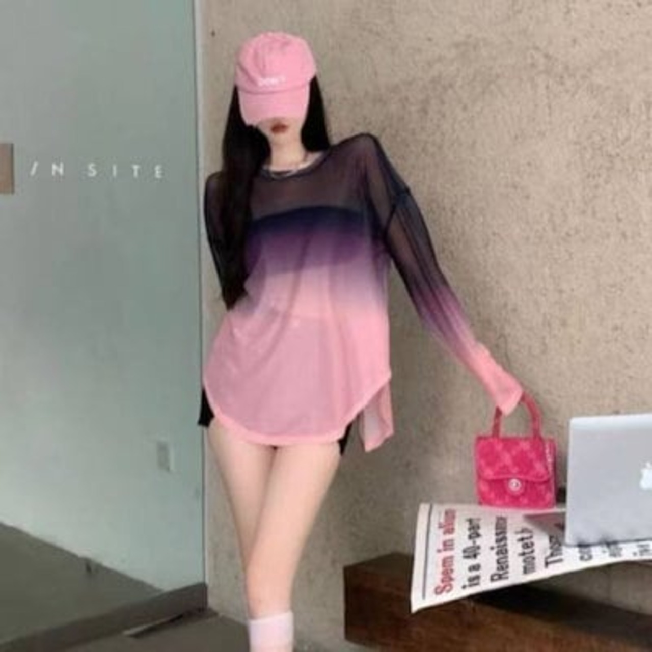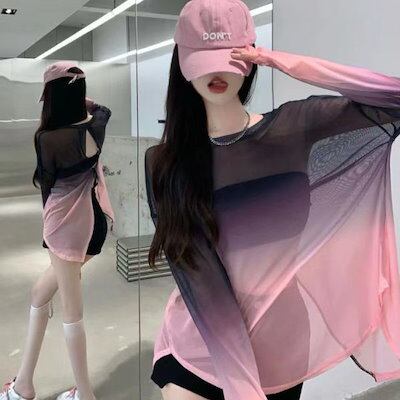 カーディガン 氷シルクグラデーション緩いサンウェアTシャツ女性2024夏の新しいトップスの中空リークバックネクタイの薄いセクション