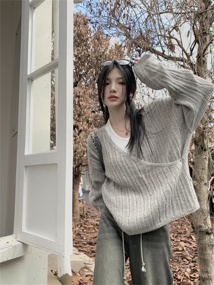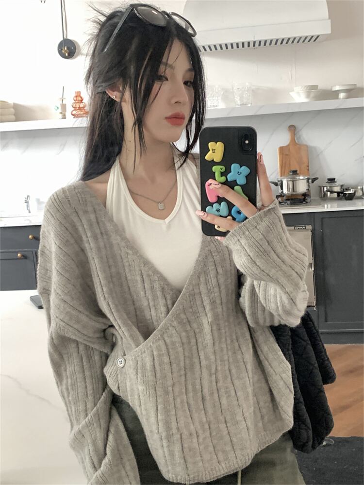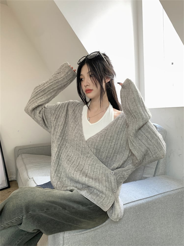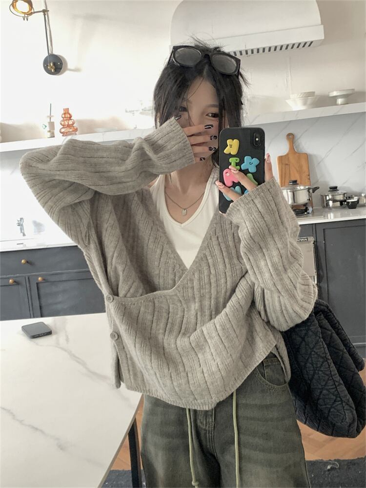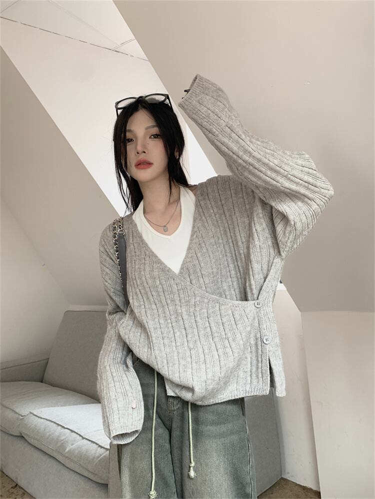 自信を持って vネック 斜めボタン ニットトップス カーディガン 秋冬 コート 長袖 トップス セーター