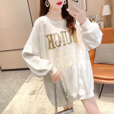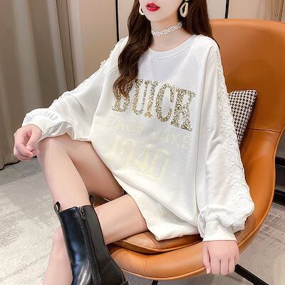秋スウェット 冬ロンT インナー薄い長袖 tシャツ レディース レーススパンコール韓国ファッション スウェット セミロング 体型カバー 大きいサイズ トップス パーカー レディース 怠惰な風