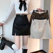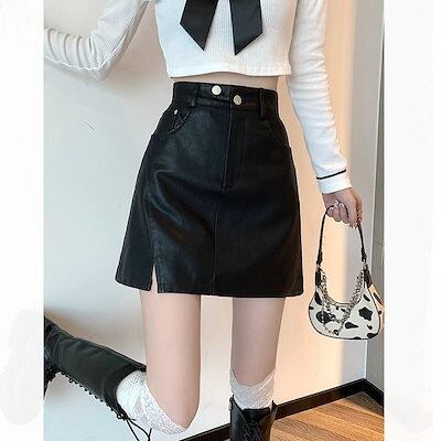 プリーツスカート 脚魅せミニスカート ショートスカート ミニスカート ニッチデザイン ハイウエスト スリット スリミング 美脚 個性 PUスカート おしゃれ 着痩せ 百掛け シンプル タイトスカート