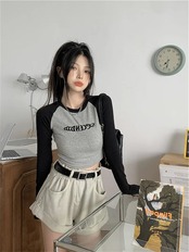 2024夏 韓国 トップス 長袖 可愛い おしゃれ タイトフィット カットソー ラウンドカラー 重ね着丈 スリーブ 女っぽ レディース Tファッション系 フェミニン きれいめ 色っぽ プリント