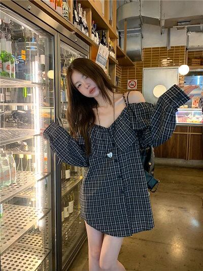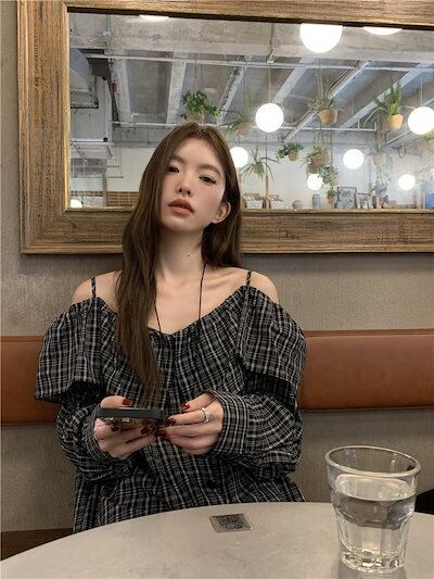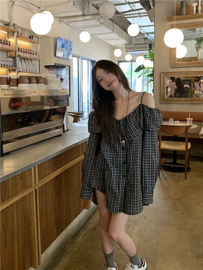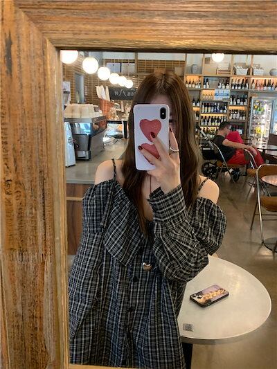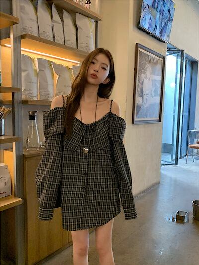 2024 秋冬チェック柄 オフショルダー シャツ ブラウス 長袖 フロントボタン 肩開き オフショル トップス ルーズ レトロ 韓国ファッション レディース 大人可愛い ガーリー