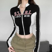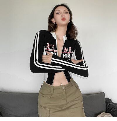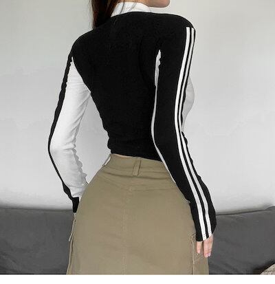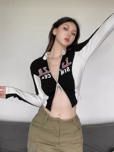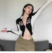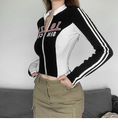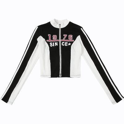 2024秋 長袖 Tシャツ ショート丈 カットソーワッペンK-POPトップス カジュアル 配色韓国系ストリートへそ出しタイトネックスリーブダブル肌見せ T ファッションレディースかわいいサイド衣装風冬