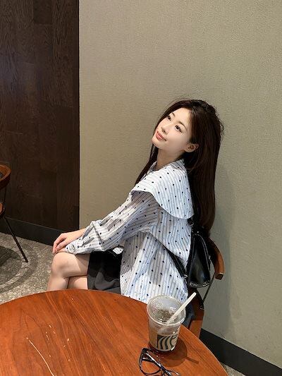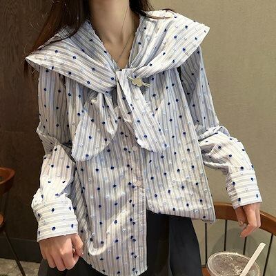 2024 秋冬トップス シャツ 長袖 ストライプ ボタン 襟 ピューリタンカラー セーラー襟 リボン 秋 青 ブルー おしゃれ かわいい 韓国ファッション レディース お出かけ