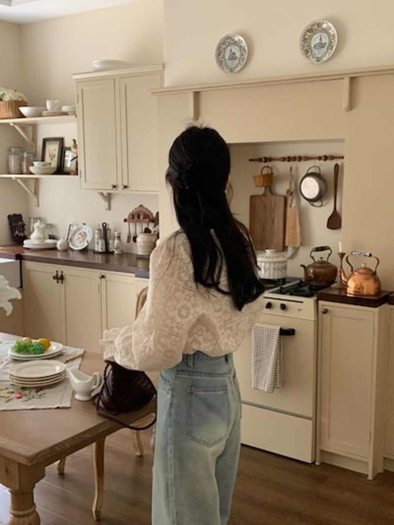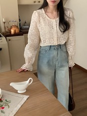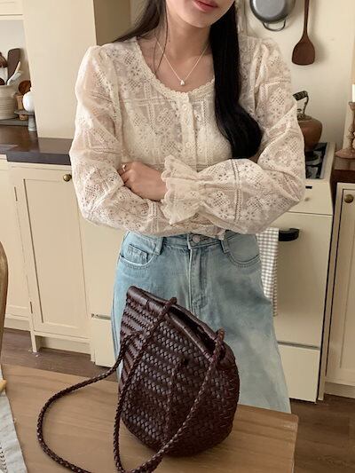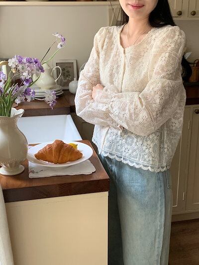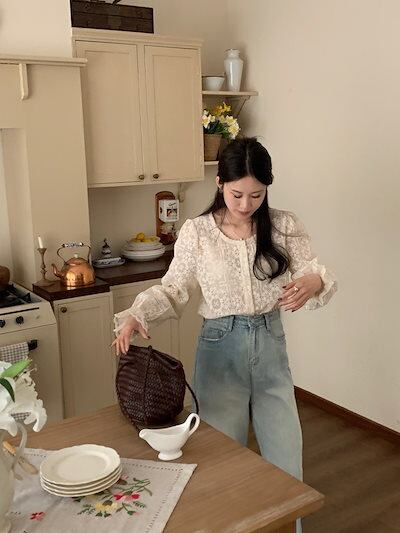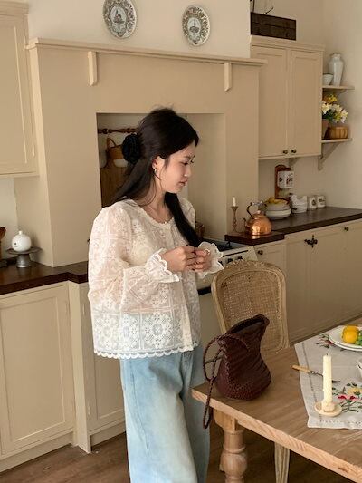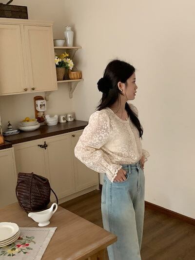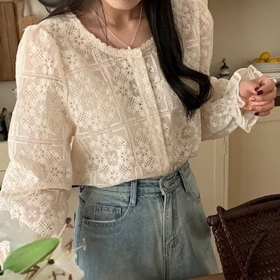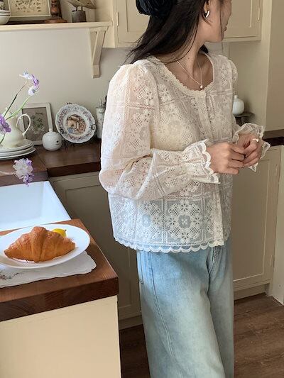 2024 秋冬トップス シャツ 長袖 ラウンドネック レース 透かし彫り ポエットスリーブ キャンディスリーブ ゆったり 秋 白 ホワイト おしゃれ かわいい 韓国ファッション レディース お出かけ