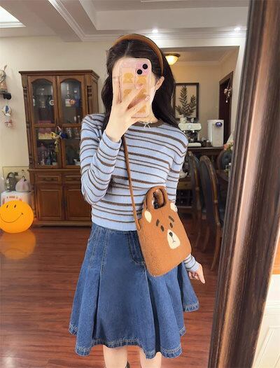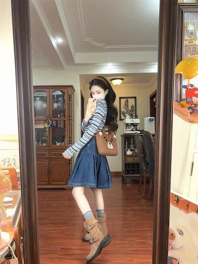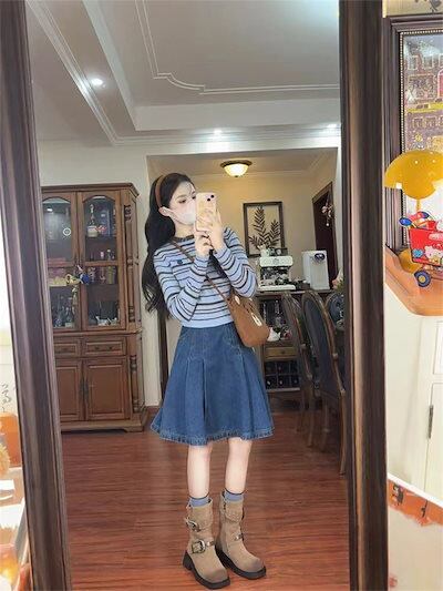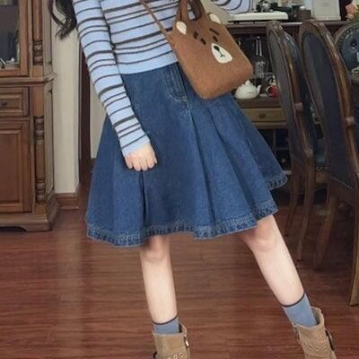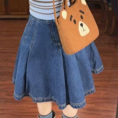 2024 秋冬スカート デニム 膝丈 ポケット プリーツ ハイウエスト 美脚効果 脚長効果 細見え 秋 青 ブルー おしゃれ かわいい 韓国ファッション レディース お出かけ