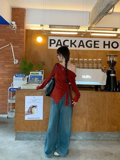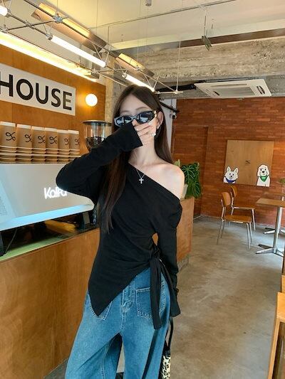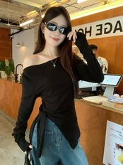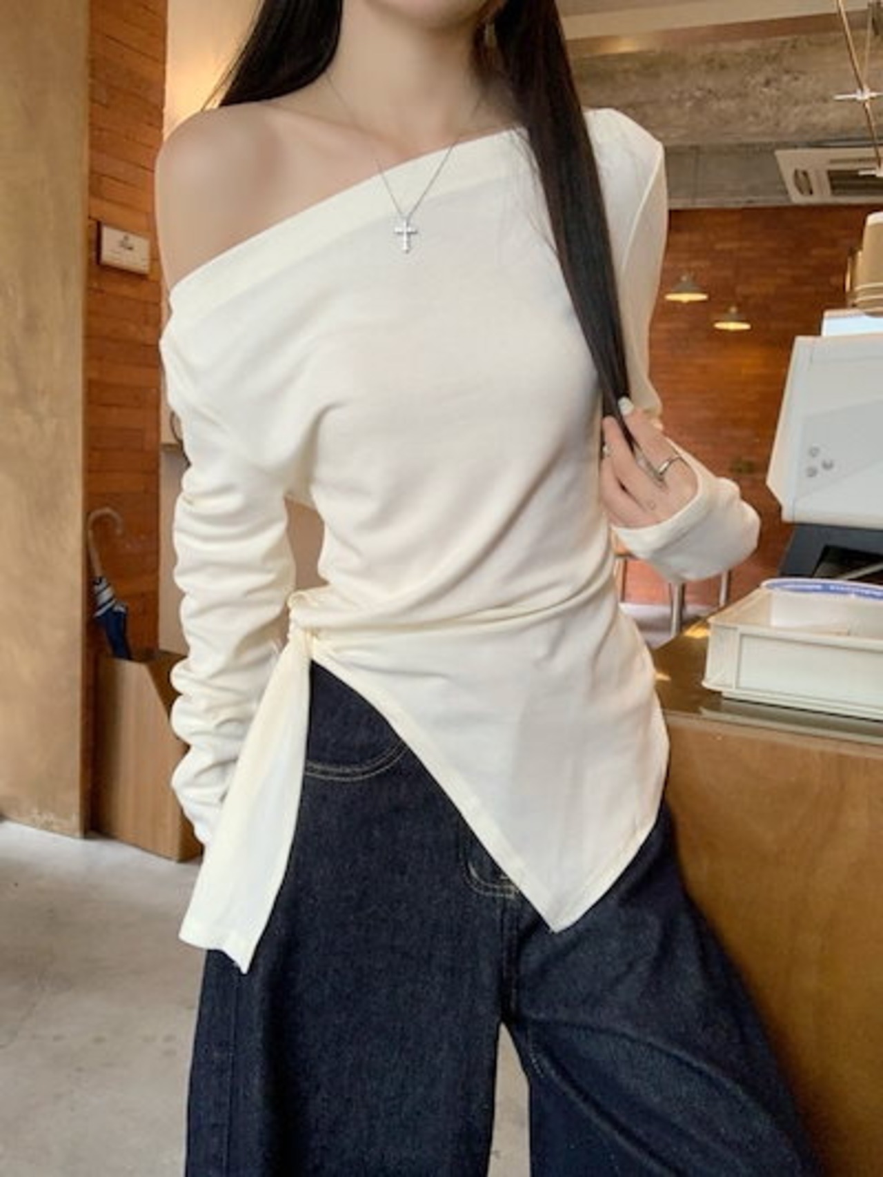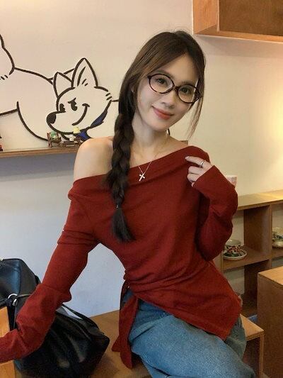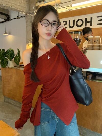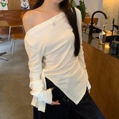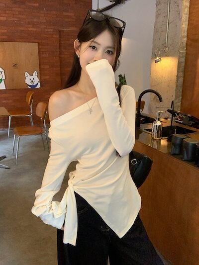 2024 秋冬トップス Tシャツ 長袖 肩見せ スリット スリム 細見え 秋 白 赤 黒 おしゃれ かわいい 大人っぽい 韓国系ファッション レディース お出かけ