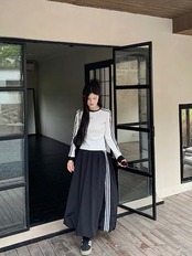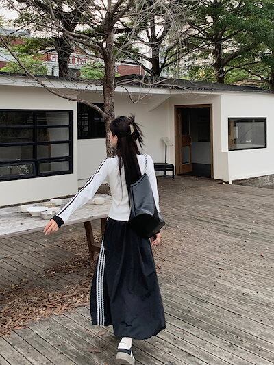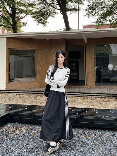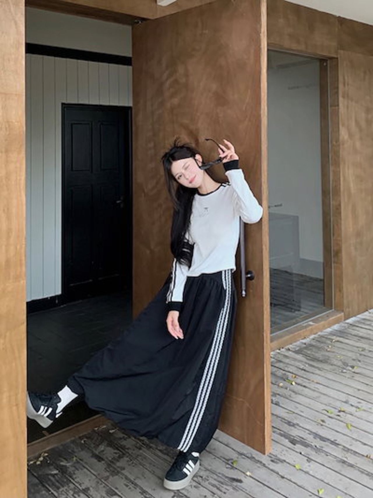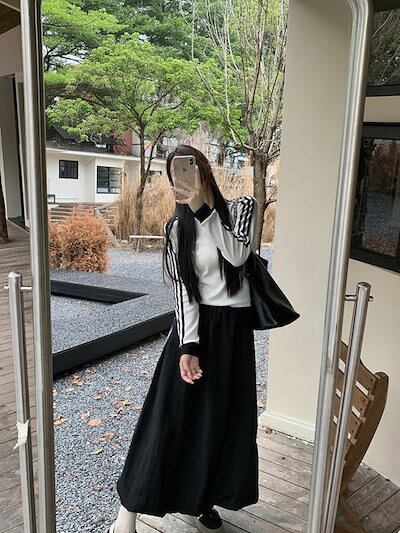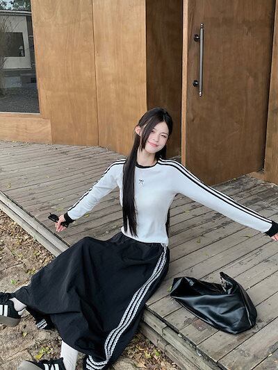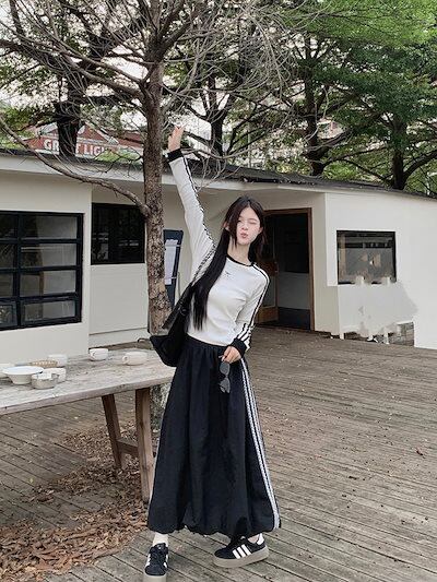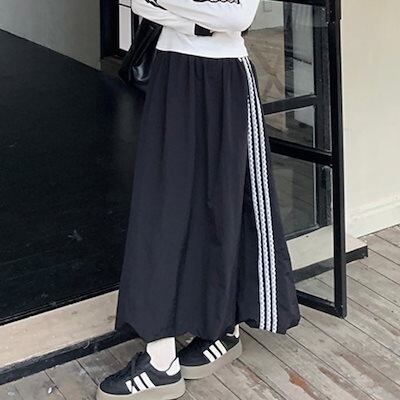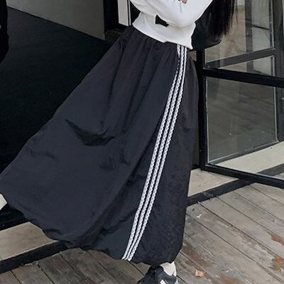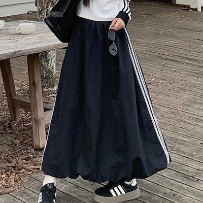 2024 秋冬スカート ロング丈 Aライン ストライプ ハイウエスト 美脚効果 脚長効果 細見え 秋 黒 ブラック おしゃれ かわいい 韓国系ファッション レディース サイドお出かけ